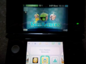 Face Raiders. I know it's blurry but at least this gives you an idea of what the flying face helmets look like, only when they come at you they're coming out whatever background is in your camera's sights. So if your 3DS is aimed at a toilet, they'll come busting out of there.