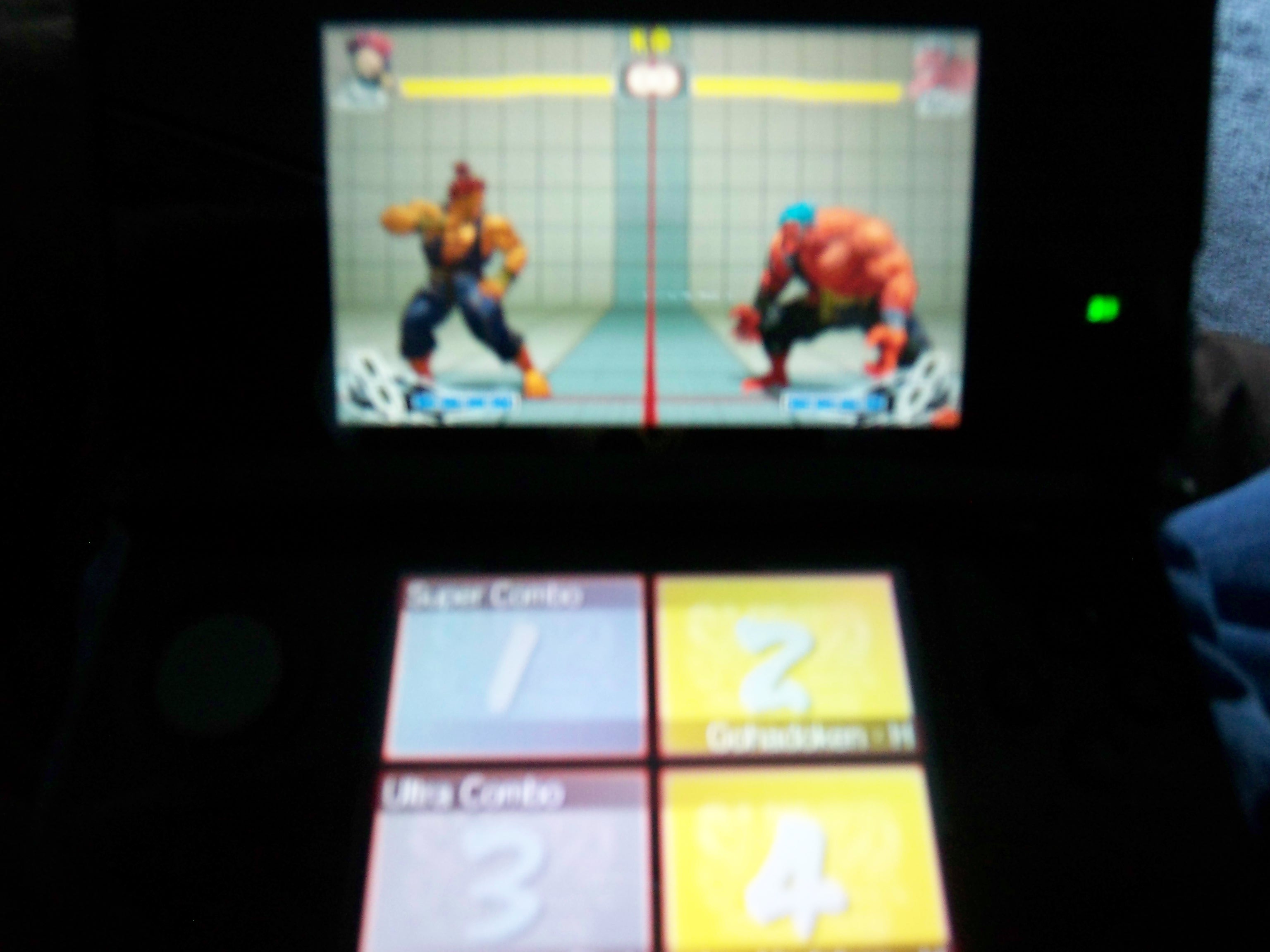 So now that I have Super Street Fighter 4 3D what do I think? Well, it’s pretty much the same experience as the console version, which is to say it’s a very good fighting game. I tried initially using the analog slider but found it to be too imprecise for a fighter and switched over to the D-pad. The D-pad is of the same quality as the DS one, just placed lower on the console. I found it a little uncomfortable after one trip through arcade mode so it’s probably not the best game for long stretches of play. Since the system is limited because of the button layout, some commands have been moved to the touch screen. On “Lite” mode, moves can be stored here. I played as Ken and the default settings were to have his super combo and ultra combo mapped to the left side, and his heavy hadoken and heavy hurricane kick (I’m not going to try to spell out its Japanese name) were mapped to the right. The face buttons default to the same layout as the home console version, which is they have the light and medium attacks and the heavy ones are mapped to the shoulder buttons. I found trying to perform a heavy hadoken the manual way near impossible as it’s just too awkward to make a quarter circle motion with my left thumb and hit the left shoulder button at the end so the touch screen move was welcomed. The ultra combos require all three punch or kick buttons to be pressed, which is nearly impossible on the 3DS, so I was happy to use the touch screen here as well. The “Pro” control mode allows you only to map attack buttons to the touch screen, including L+M+H commands, if you find having actual moves too easy. I can see that working fine, but since smudges on my touch screen drive me nuts I’ll probably stick with Lite. I also re-mapped the buttons so that the medium attacks were on the shoulders and the heavy on the console’s face. This made it possible for me to execute EX moves and also kept the light attacks on the face to execute quick throws.