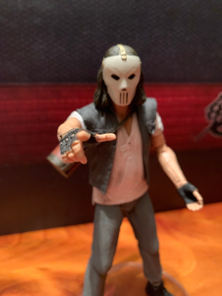 Casey’s sculpt looks to be pretty damn accurate to the screen version. He has a white t-shirt with a vest over it that’s actually a shirt with cut-off sleeves. Both the shirt and vest are a soft plastic, though the sleeves on his arms are sculpted. He’s got his gray sweatpants on and black high-tops to go along with fingerless gloves for added bad-assness. The mask is the star of the show though as it looks great. It’s a thick plastic with a glossy paint-job that looks great. The decision to sculpt it separately with a face underneath also means his eyes looks menacing and the slits over the mouth could be actual cuts in the plastic rather than painted lines. If anything appears to be a touch off, it’s the hair which looks heavy as opposed to the more frizzy appearance it had on film. Hair is notoriously difficult to sculpt though so this barely registers as even a nit-pick. The knees also a look a tad odd, but again, that’s because NECA is trying to recreate a soft cloth like sweatpants in plastic form. NECA opted to make the plastic of the thigh go over the lower leg rather than do a kneecap. It’s tough to say what would look better and I bet the sculptors were left wishing the character had sported knee pads in the film. I’m curious if the expected quarter-scale version will experiment with soft goods for the sweatpants or stick with plastic.