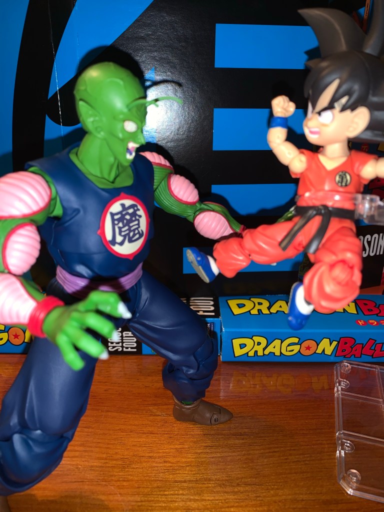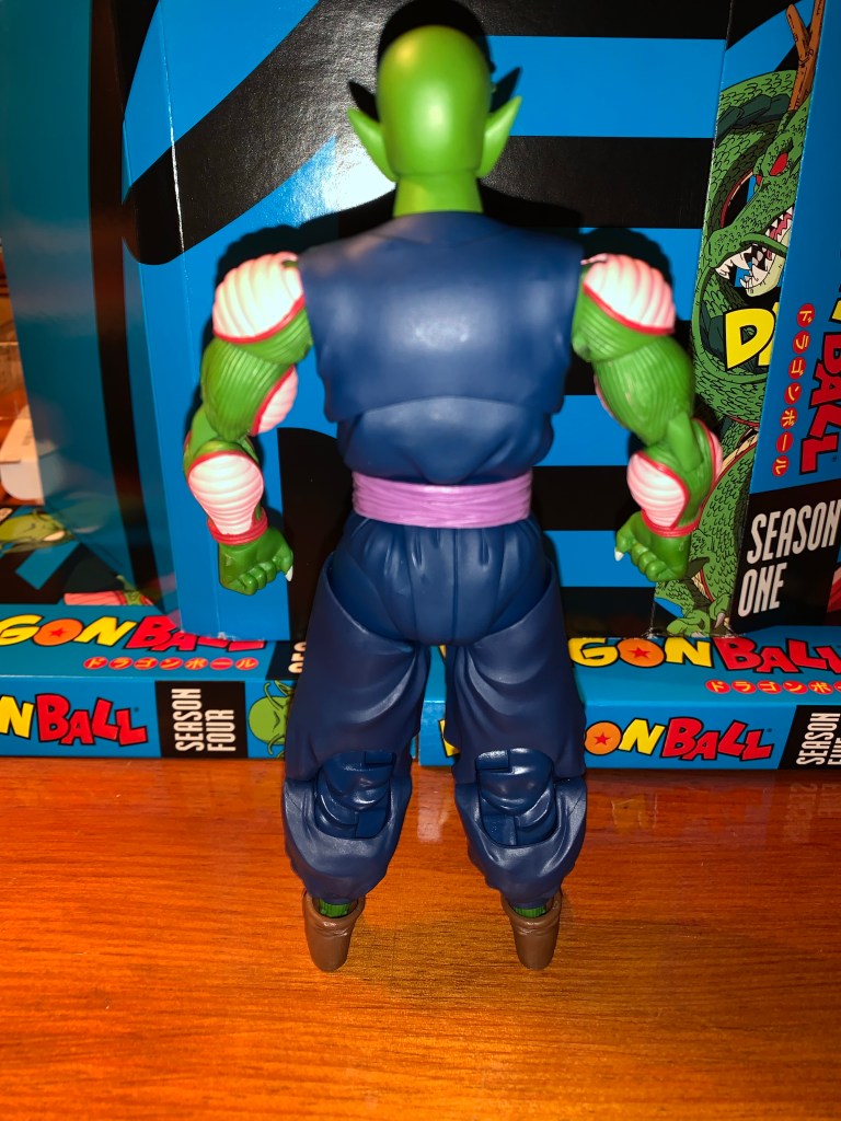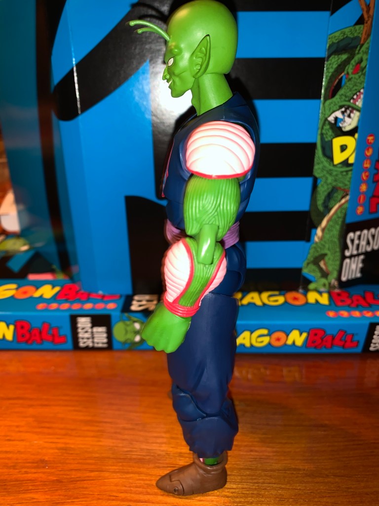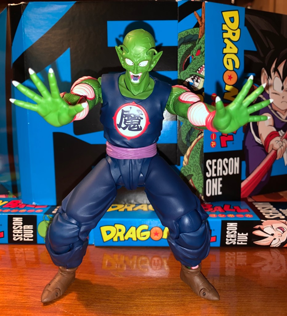 King Piccolo is one of the more recent releases in the line of Dragon Ball action figures released by Bandai and Tamashii Nations under the S.H. Figuarts banner and he’s a big boy. He’s the main villain of the penultimate arc of Dragon Ball as he escapes from his imprisonment and is able to assemble the dragon balls and wish for his youth to be restored. He is depicted here following that wish in his navy blue gi and cocky smirk. In many ways, he’s the ultimate villain from the original Dragon Ball and, once defeated, it’s his son/clone who would continue on to Dragon Ball Z and become the more popular Piccolo.