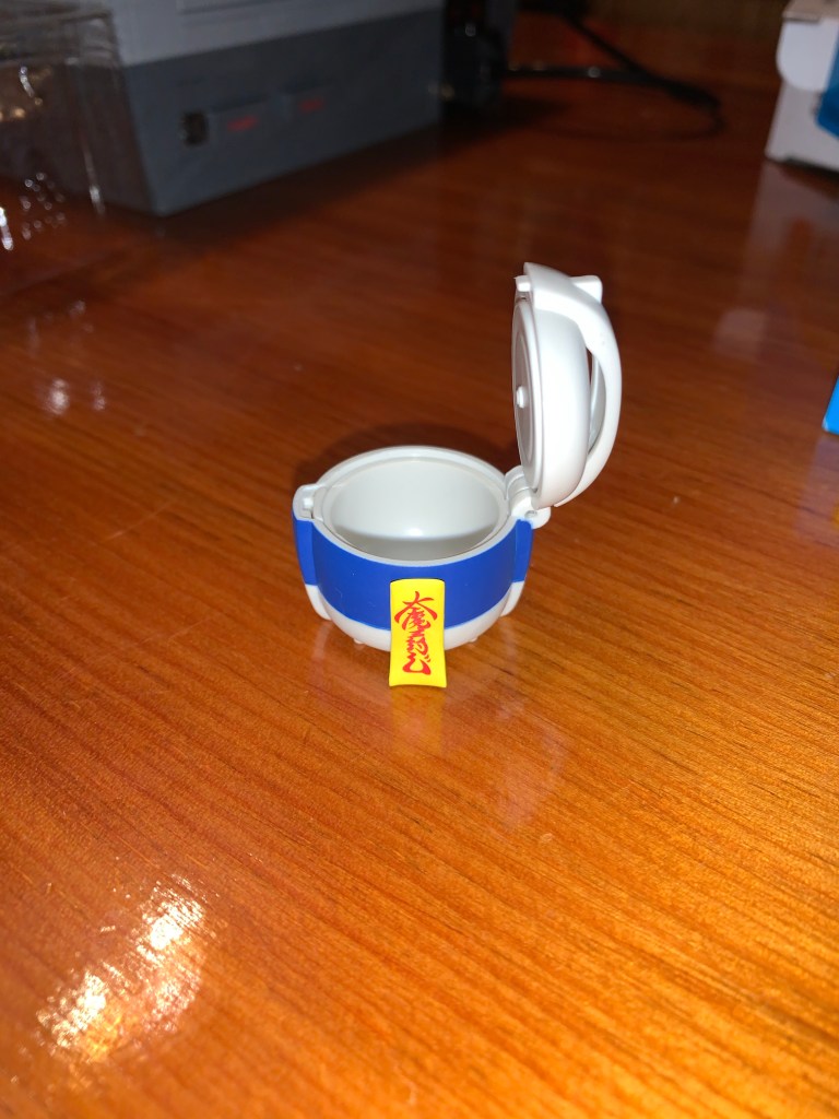 Piccolo comes with an array of different hands and heads as well as a few other accessories. As is the tradition with the Dragon Ball figures, he comes with a dragon ball of his own. In this case, the one star ball. It looks so tiny in his giant hands. He comes packaged with a pair of fists and a smirk on his face. He has a pair of open, clawing, hands and a pair of fully open hands like he’s firing off his energy blast. He also has a right hand in a karate chop position and a pointing right hand. On the head front, he’s incredibly expressive as in addition to the smirk he has a teeth gritting expression, a yelling expression in which his veins are popping out and his eyes bloodshot, and a “puking” head from when he regurgitates the egg that contains Piccolo Jr. Speaking of which, he also has that egg which has some septum at the end of it to make it look like it’s being fired through the air. There’s also a piece of mucus that it can sit in like a football tee. Lastly, there’s the electronic rice cooker which once held him prisoner. It can open and close and is a cute little accessory.