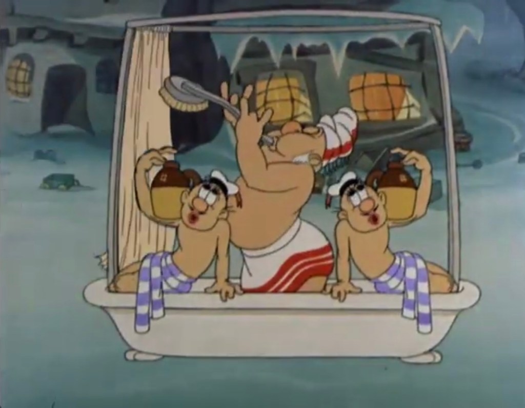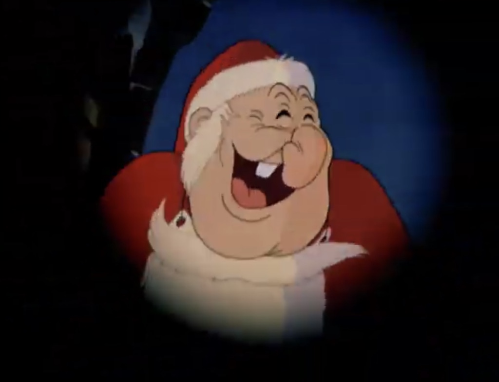 The townsfolk do not respond in kind to this livelier version and soon start tossing all manner of junk from their homes in a bid to silence the troupe. For some reason, everyone is dressed as Santa Claus too. Eventualy they start throwing larger objects like a piano, freezer, and even a bathtub which the boys have some fun with. As the song moves along, they start getting pelted with toys as they row the bathtub down the street. Soon, they have enough toys to fill the sleigh, and John Silver instructs his would-be reindeer to head back to the house he massacred earlier.