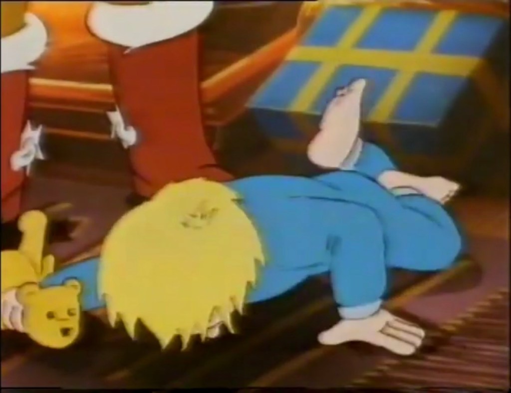From the sky, the duo of SuperTed and Spotty are unable to spy the sleigh once again, but SuperTed sees tracks heading to a cottage. They head for it quickly and SuperTed flies down the chimney and ambushes an individual in the house. A young girl (with a lit candle, even though this appears to take place in a post electricity era) hears the commotion, and heads for the living room to find SuperTed atop Father Christmas! She shouts for him to stop, but SuperTed assures her this Father Christmas is a fake. Only he’s not, and the clump of hair SuperTed rips from his chin is proof of that. The traumatized old man begs SuperTed to leave him alone, while he hides the clump of beard hair behind his back and feigns innocence. Spotty then notices the sleigh is gone and some ominous music takes us out of the scene.