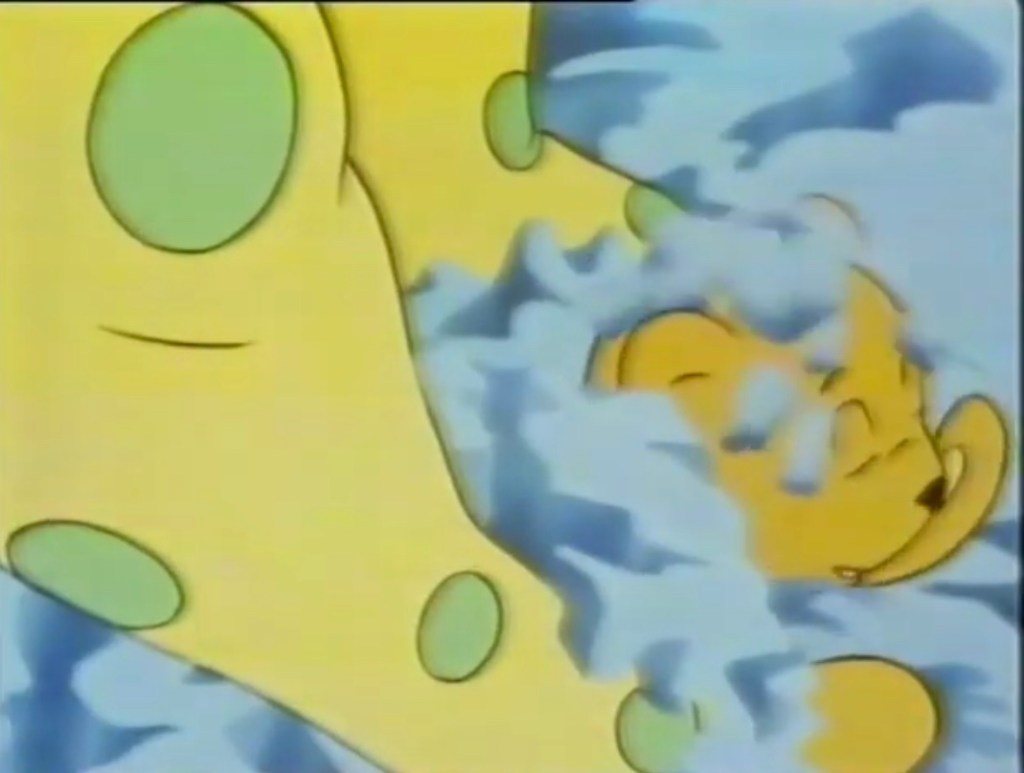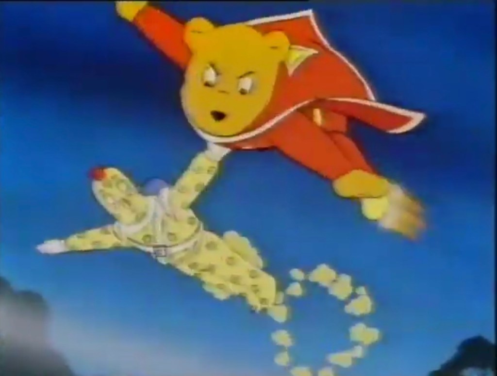 Every episode of SuperTed begins with a narrator (Peter Hawkins) who tells the viewer how SuperTed came to be. Apparently Spotty (who looks like the love-child of C-3PO and Mr. Poopybutthole from Rick & Morty) found a discarded teddy bear deemed defective and used some space dust to bring him to life. He took him to Mother Nature (in space?) who gave Ted his powers. Again, I remember nothing of this, but the one thing that did jar my memory was seeing Ted transform into SuperTed as it’s this horrifying animation of Ted ripping off his skin to reveal the costume below it. This visual has stuck with me because as a kid I found it really confusing, and a bit frightening. I don’t know if the show ever depicted him doing the inverse and how that worked. Does he just rip his costume off and he’s a bear again? Is he wearing a false suit of fur over his costume at all times? It’s certainly different, but leaves so many questions unanswered.