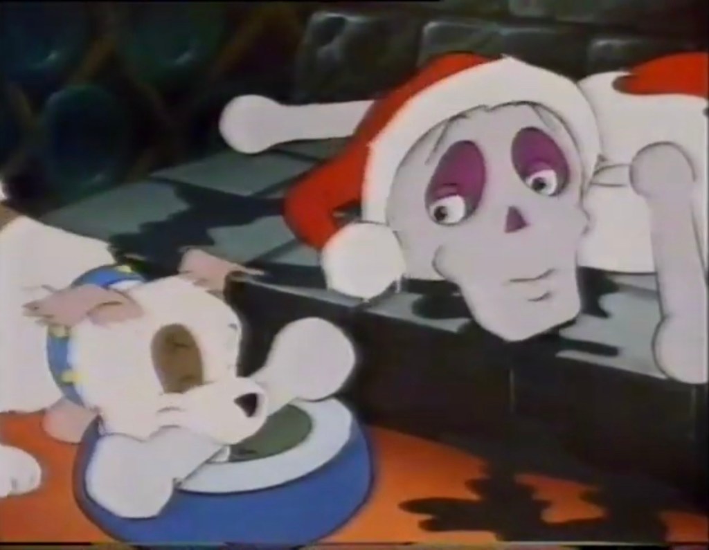 Inside the house, Skeleton has fallen to pieces from hitting the ground after descending the chimney. A dog sees him and soon makes off with his arm. Spotty and SuperTed view him through the window basically just to mock him and wish him a Merry Christmas. He begs for help in retrieving his arm, but Spotty and SuperTed care little for the predicament Skeleton finds himself in.