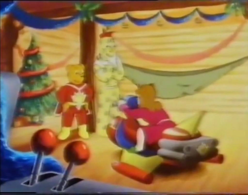 Elsewhere, Ted and Spotty are trying to get warm in their hideout, which is apparently a tree house. It looks like a rather ordinary tree house, save for the giant communication equipment on one wall. A buzzer goes off and Ted checks the video monitor. The boy we saw earlier tearfully relays to Ted that Father Christmas has made off with all of his toys and ruined his Christmas. Ted won’t stand for this, and quickly transforms into SuperTed while Spotty puts on his jet pack.