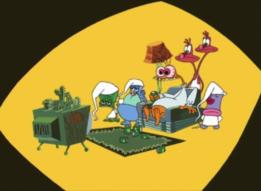 The episode begins with the aliens sitting around the television in their pajamas watching a horror movie. Our aliens are Candy, Gorgious (Danny Mann), Bud (Jeff Bennett), Stereo Monovici (Jeff Bennett), and Etno (Maurice LaMarche). Candy has that Charlie Adler gay voice you’ve probably heard before while Etno is LaMarche doing his Vincent Price impression. It’s a colorful collection of voices that are quite suitable for these illustrations.