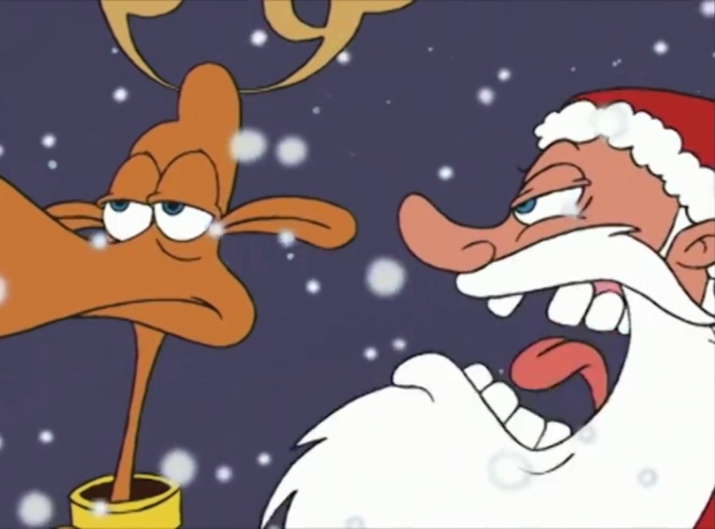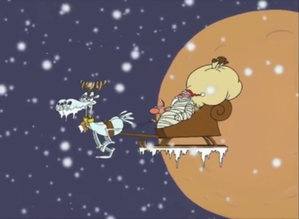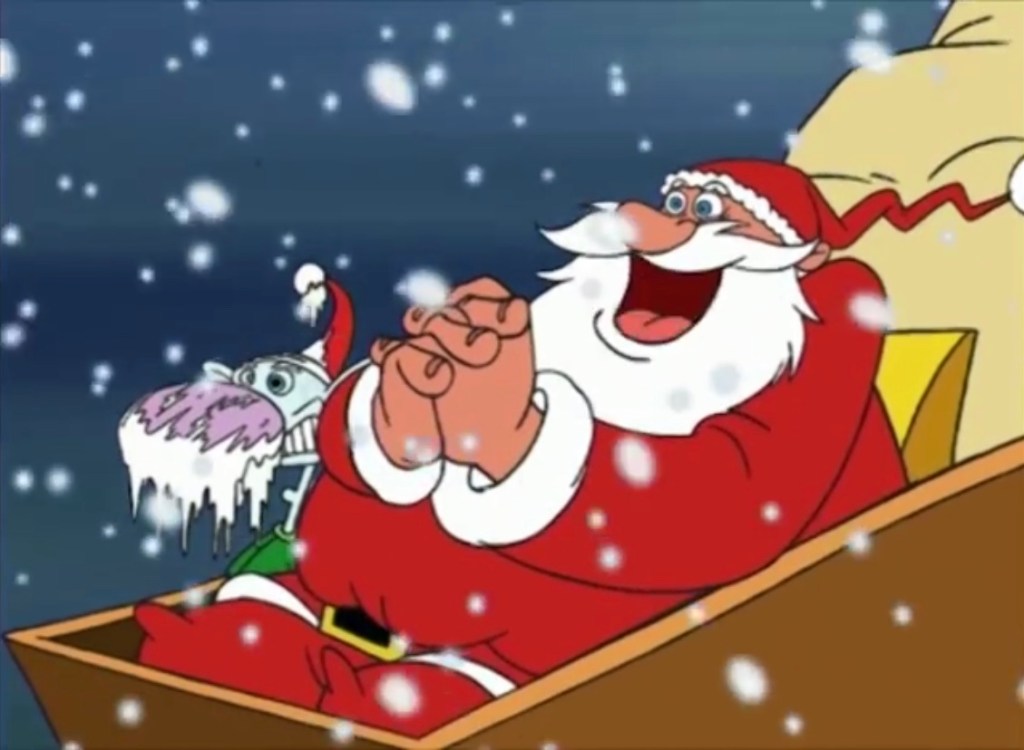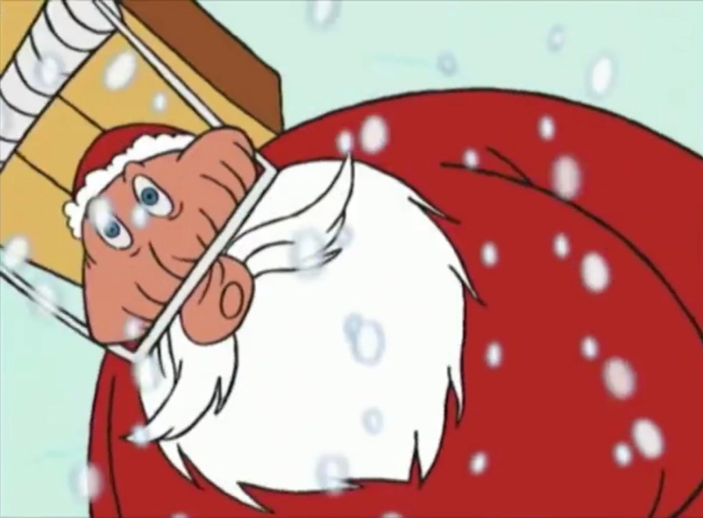 When Bud hears noises coming from the roof he wakes up the rest of his alien buds who all gather at the fireplace. Bud is convinced the red blob from the movie he was watching is coming after them, but the rest aren’t so sure. Etno takes a look up the chimney and he does indeed see a big red blob coming his way. Of course, this isn’t a monster, just Santa’s big red ass which crawls down the chimney with animation that reminds me of Stimpy’s butt dance during the “Happy Happy Joy Joy” song from The Ren & Stimpy Show.