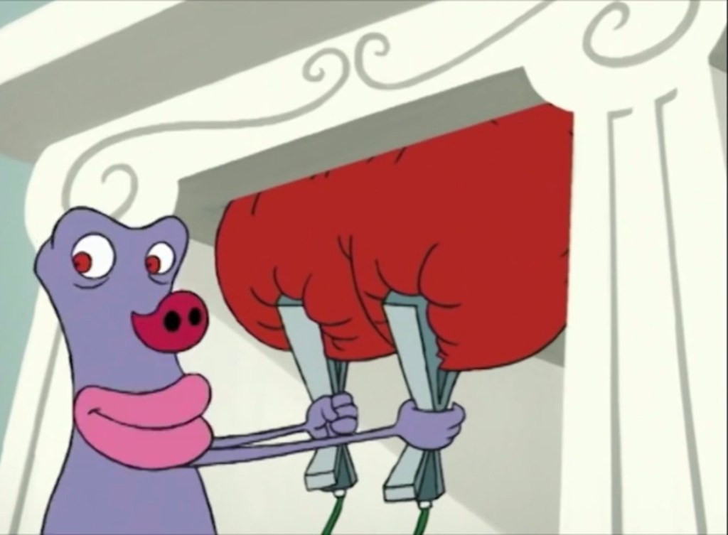 Inside the house, the aliens are congratulating Gorgious on a job well done, their pajamas suddenly vanishing. Bud isn’t congratulating anyone though as he knows the blob will be back. He then screams and points at the fireplace as some goo starts to leak in. Etno nominates Candy to do something about it, and he turns to the camera and says “Ships” to express mock enthusiasm in a cheeky manner.