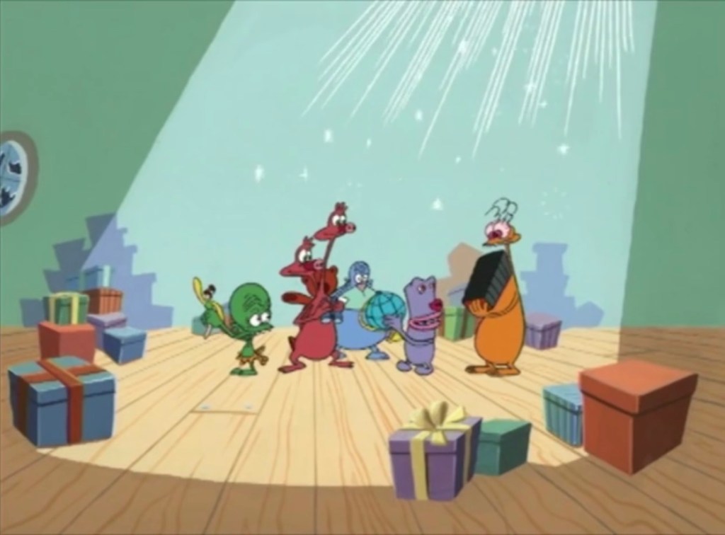 Santa is sent blasting off into the night sky leaving the aliens feeling victorious. As they celebrate, presents start littering the room. The aliens are confused, but they begin to open them and find them to be full of things they wanted, including a new teddy bear for Gorgious. They realize that whoever was trying to get into their home meant them no harm. Stereo remarks how they mistook him for the color of his skin, and it seems the aliens are about to learn an important lesson, until Etno wonders aloud what else he brought them and they dive back into the presents.