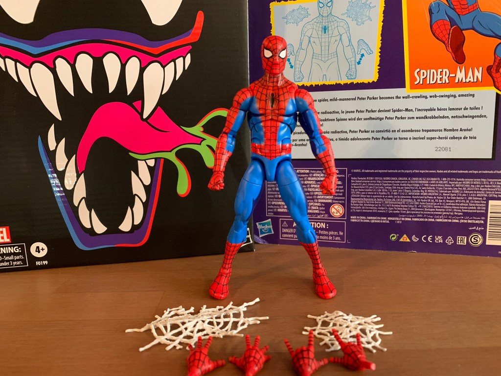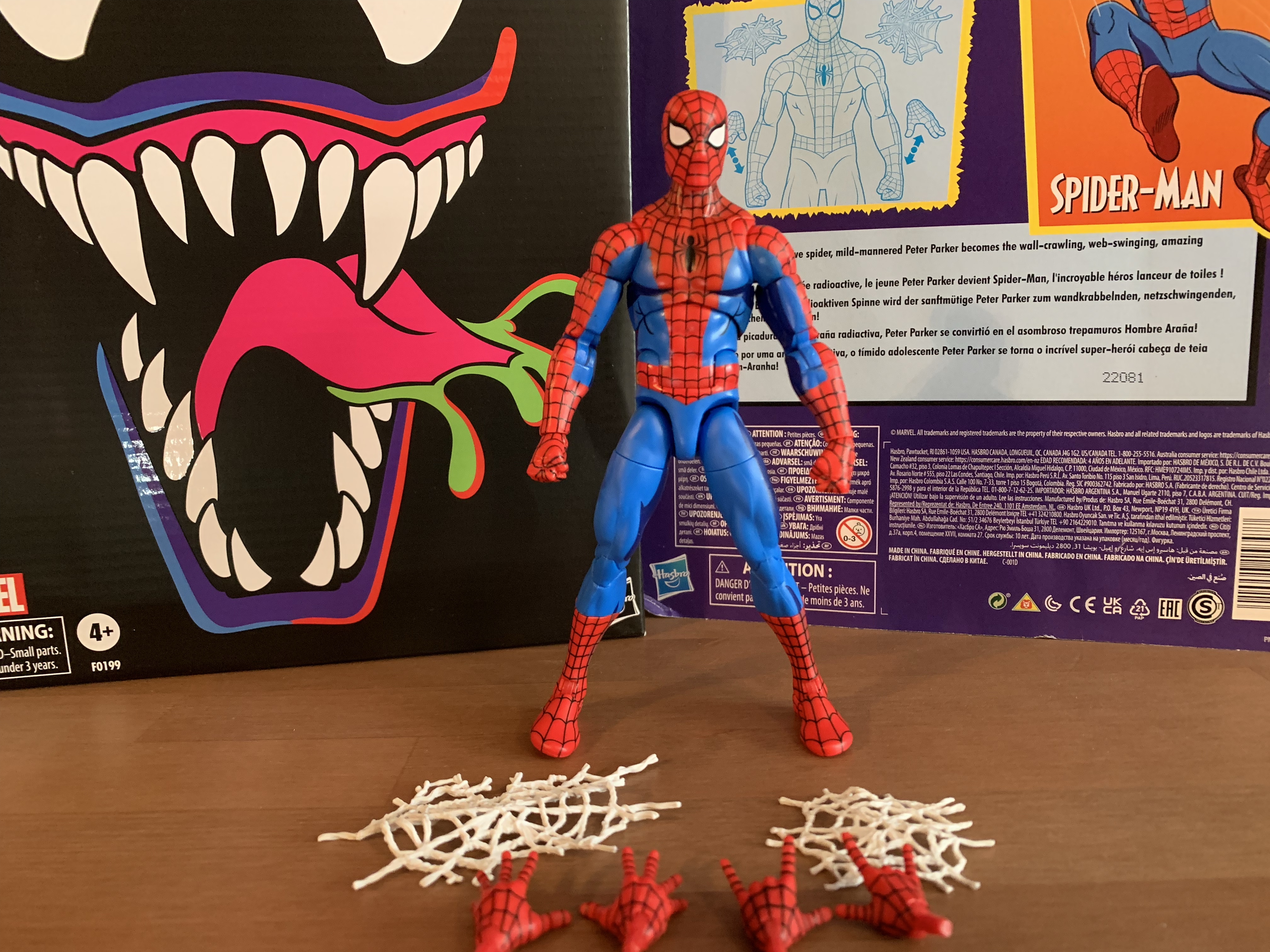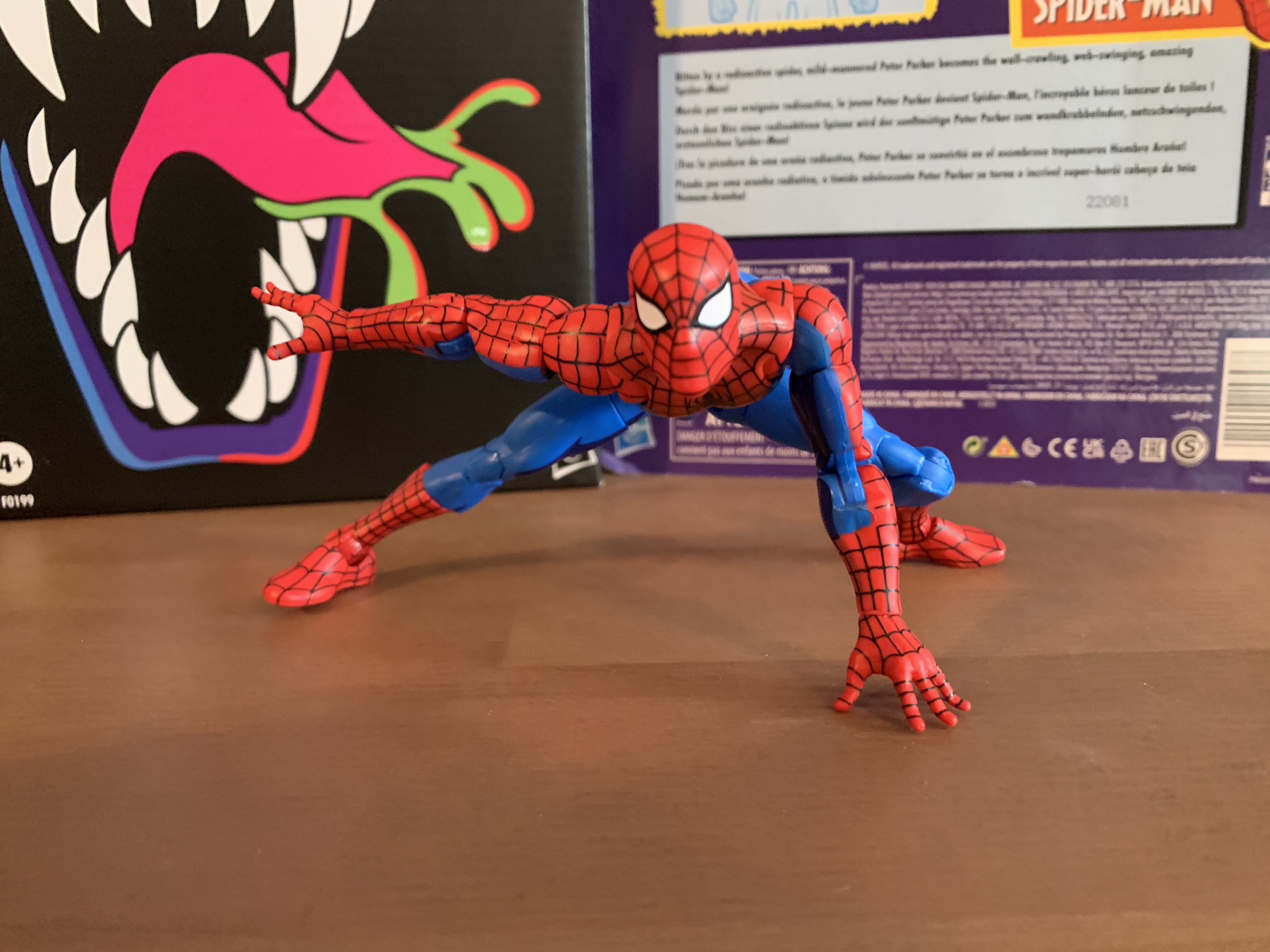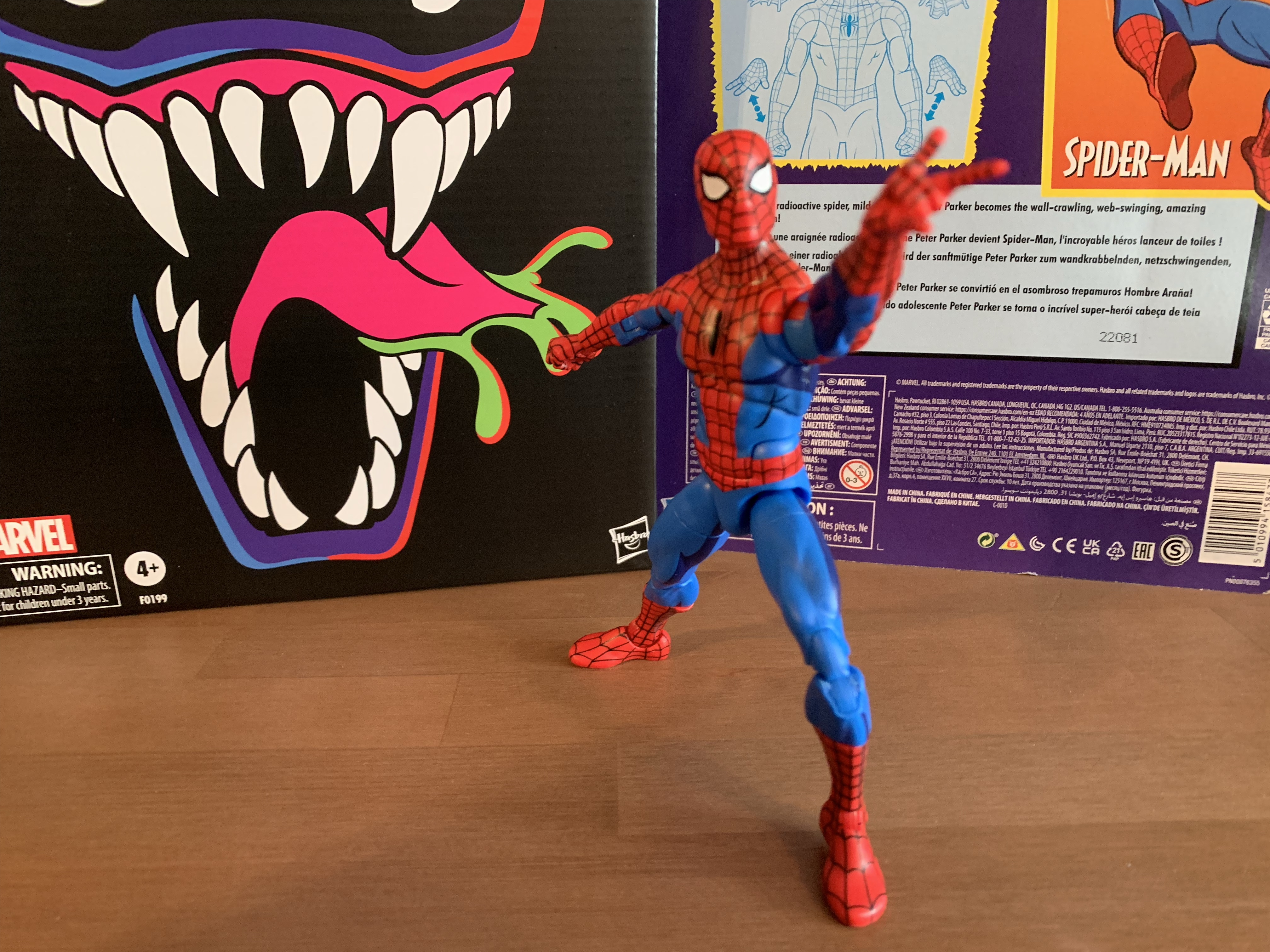 2022 saw Hasbro double-down on the retro releases as it launched the X-Men Animated Series subline of Marvel Legends. While we can certainly debate how hard the company actually went in to trying to recreate the characters as they appeared in the show, the line did try to showcase those characters with some animation specific shading and (in some cases) sculpts. The line must have been successful because Hasbro is doing the same in 2023 only with Spider-Man as the featured series. Why now? I don’t know. The X-Men line coincided with the show’s 30th anniversary and it would have made sense to do the same for Spider-Man in 2024, but Hasbro is apparently far too eager to wait another year. The show is getting the same treatment in that it’s likely to be reused sculpts with some shading added and it’s all packaged in a box designed to mimic a VHS release. The first set, as they’re apparently going with two-packs for now, won’t be out for a few more months, but we essentially got a preview to close-out 2022 in the form of an exclusive Spider-Man sent to Walmart. This Spider-Man is sold on a retro card designed to resemble the old Web Racer Spider-Man toy from the 90s. The image is essentially the same, but since there wasn’t much in the way of preservation for those old cards it had to be redone and has been lovingly recreated by artist Harry Moore. This time, Spidey is fully posable and doesn’t have a string running through him. It’s a new sculpt, though not a unique sculpt, and most importantly it features a cel-shaded paint job to fit-in with the previously released Venom.