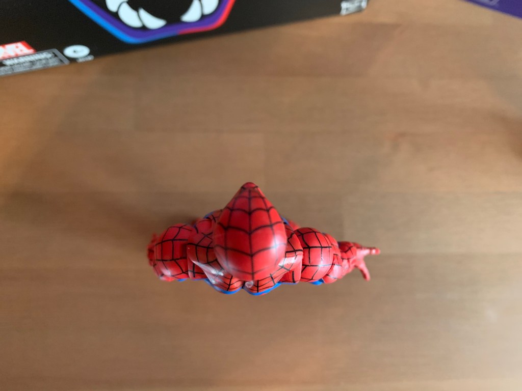 Once opened Spidey stands at a tick over 6″. This sculpt is apparently the same as the first appearance Spider-Man also released in 2022 in the new style of packaging. It’s a pinless body and it’s notable because it’s a smaller Spider-Man. He’s well-defined, but not as bulky as the other new Spider-Man body from this year released in the Renew Your Vows two-pack. This is probably Hasbro’s best Spider-Man body to date. I’m certainly not an expert as I only dabble in Marvel Legends, but it’s much better than the Web-Man and Symbiote figures I do have. It still has its problems, which we’ll go over, but just overall has a nice shape. The smallish Legends shoulders aren’t laughably small here and most of all I just like this shade of blue that’s in use. It’s a light blue, shaded with a darker blue, and it just captures the look of the character from the era. I get more of an 80s vibe if anything from the color combo, but it’s fine as an animated version too, though I’d argue his blue was actually darker in the show. The only thing about the sculpt I don’t like is the head. It’s a little big, plus it feels pinched in the front. I don’t know why it’s not more round as it doesn’t even look like a human face could make this shape. It’s a shame, because the eye shape is nice and it’s pretty well-painted. Many have complained that web lines on their figure are off-center. Mine is, but it’s small. You can see it by looking at the hexagonal shape in the middle as one side touches the tip of the eye lens while the other does not.