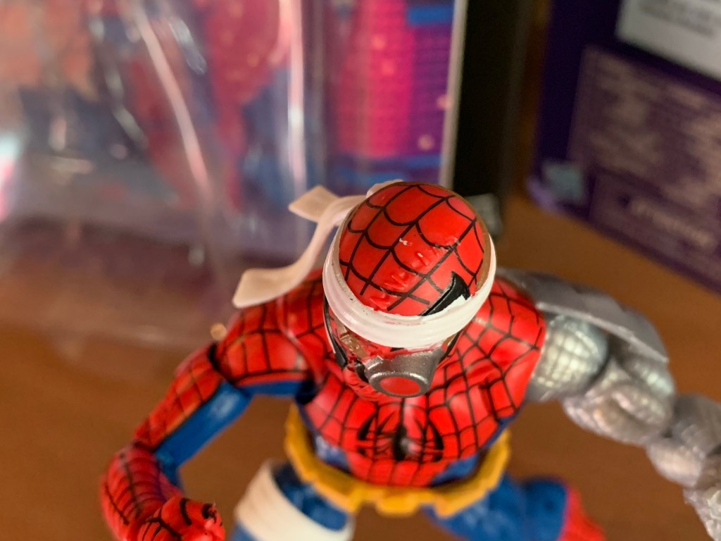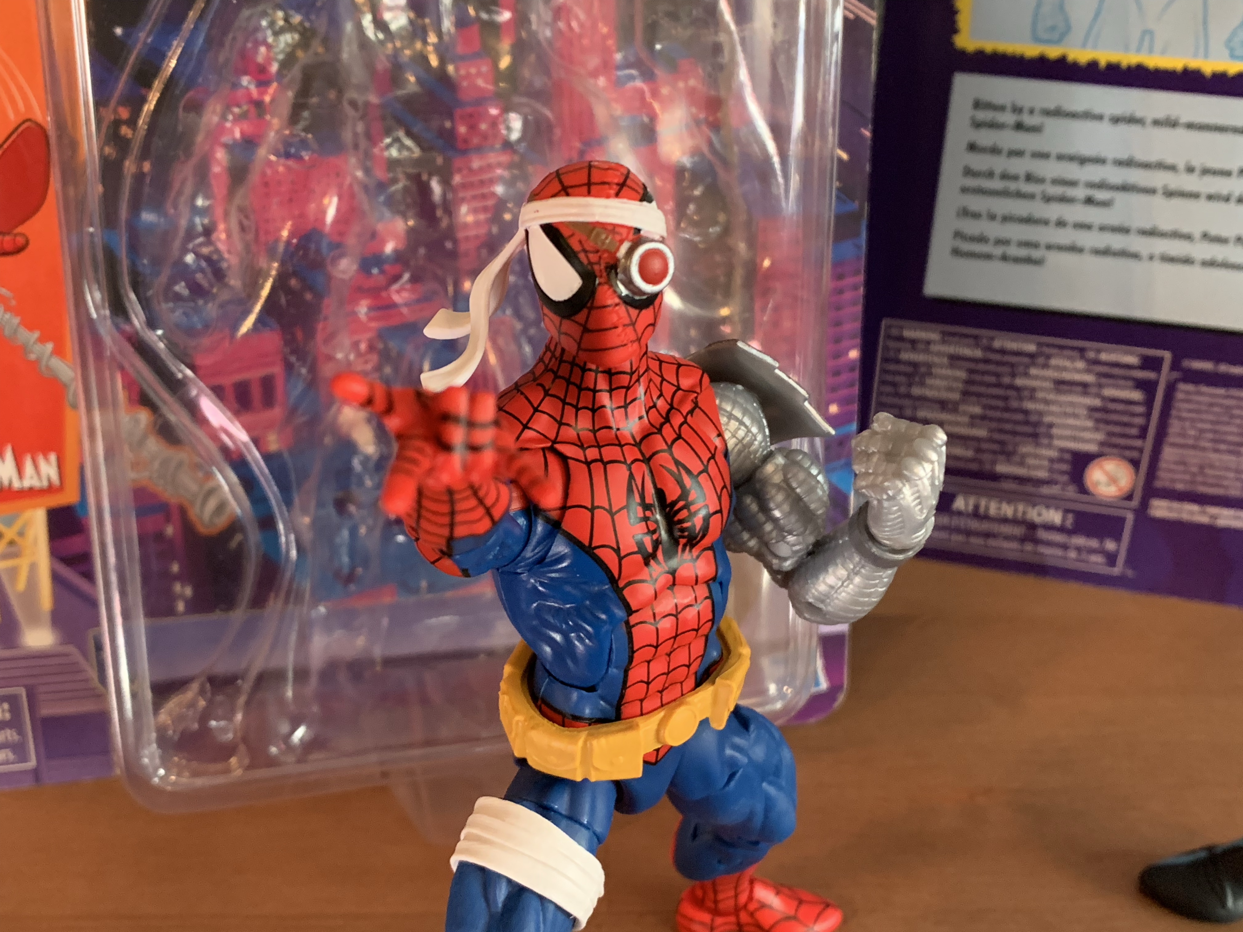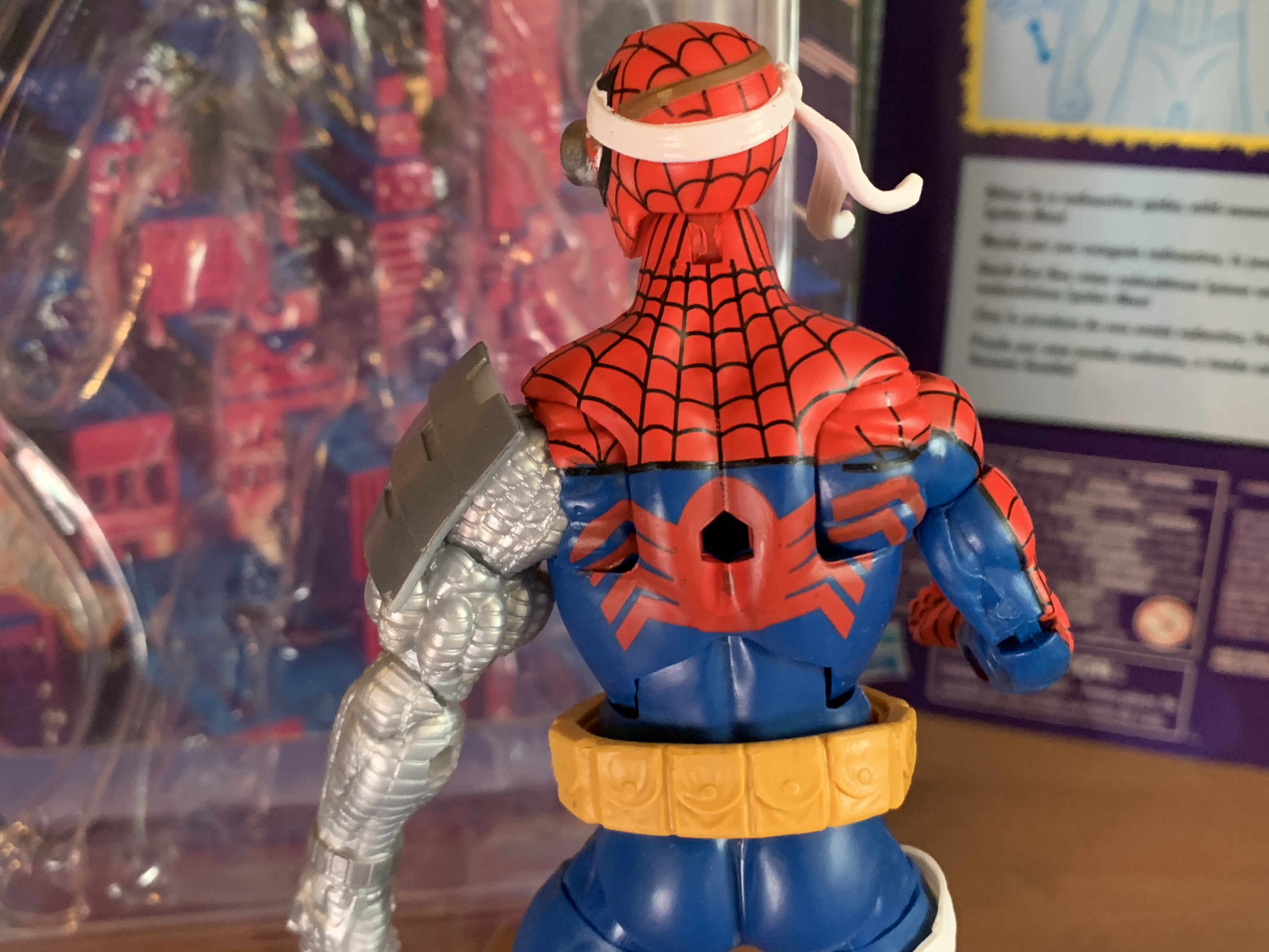 The articulation for this Spider-Man is not really it’s strong suit. I suppose we shouldn’t expect a cyborg version of the character to move as well as a traditional one, but I thought it would be a little better than this. The head is on the usual ball hinge which provides good enough range up and down, but not much nuance posing. The shoulders are ball-hinged and pretty limited out to the side. The left arm is hindered by the big plate on the shoulder, but even the right arm can’t quite hit a horizontal pose. There is a butterfly joint which provides more range going back than forward. It’s okay, but a bit ugly because the paint isn’t continued as far as the joint goes so you end up with gaps in the weblines on the front and the spider legs on the rear. The elbows are double-jointed on both arms and both can bend past 90 degrees. The cybernetic arm can even go further than the right arm as more plastic was cut away to make it work. The wrists rotate and hinge horizontally while the abdomen features a ratcheted ab crunch. It only allows one click back and one click forward so the range isn’t impressive. The waist twist is a waist twist and it is at least hidden by the belt because otherwise it would look pretty hideous. The legs can just about hit a split with a little effort, why newer figures can’t is a real mystery, while the legs kick forward to about horizontal with no range going back. We get the usual thigh cut and the double-jointed knees work just fine. There’s a boot swivel and the ankles hinge forward and back pretty far and feature a steep, but usable, ankle rocker. It’s nothing particularly impressive, but I don’t know what kind of posing most want to do with this guy. I tend to think he should be posed more like a brawler than the nimble Spider-Man of norm, but that could be just me. By Legends standards, it’s basically average.