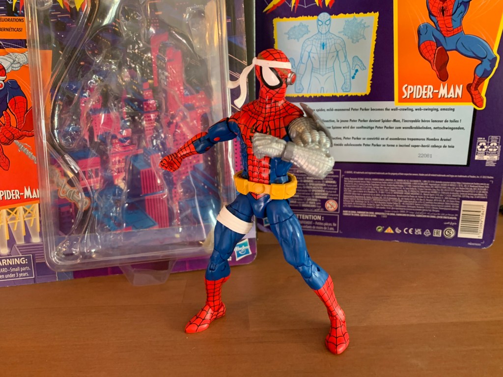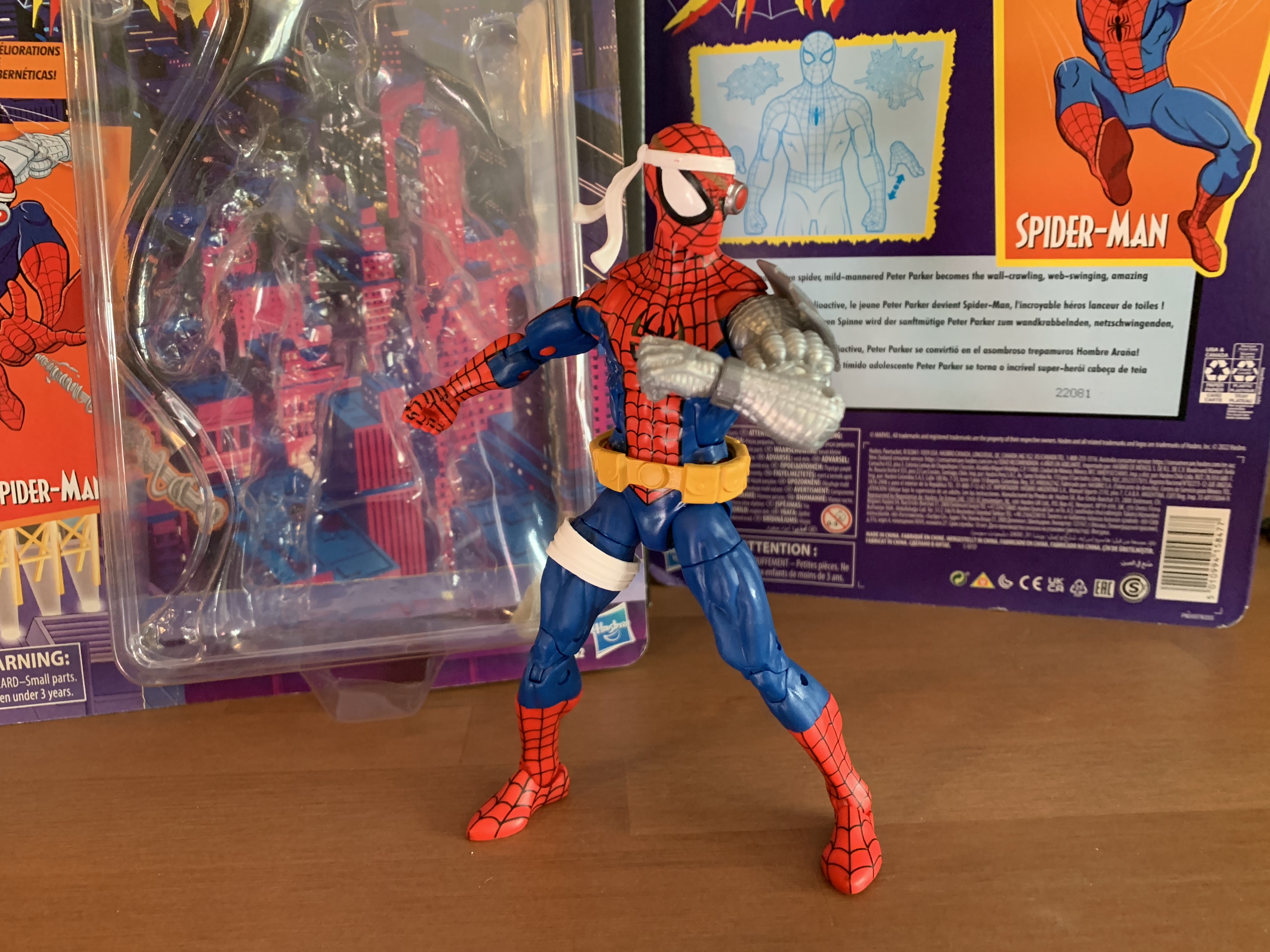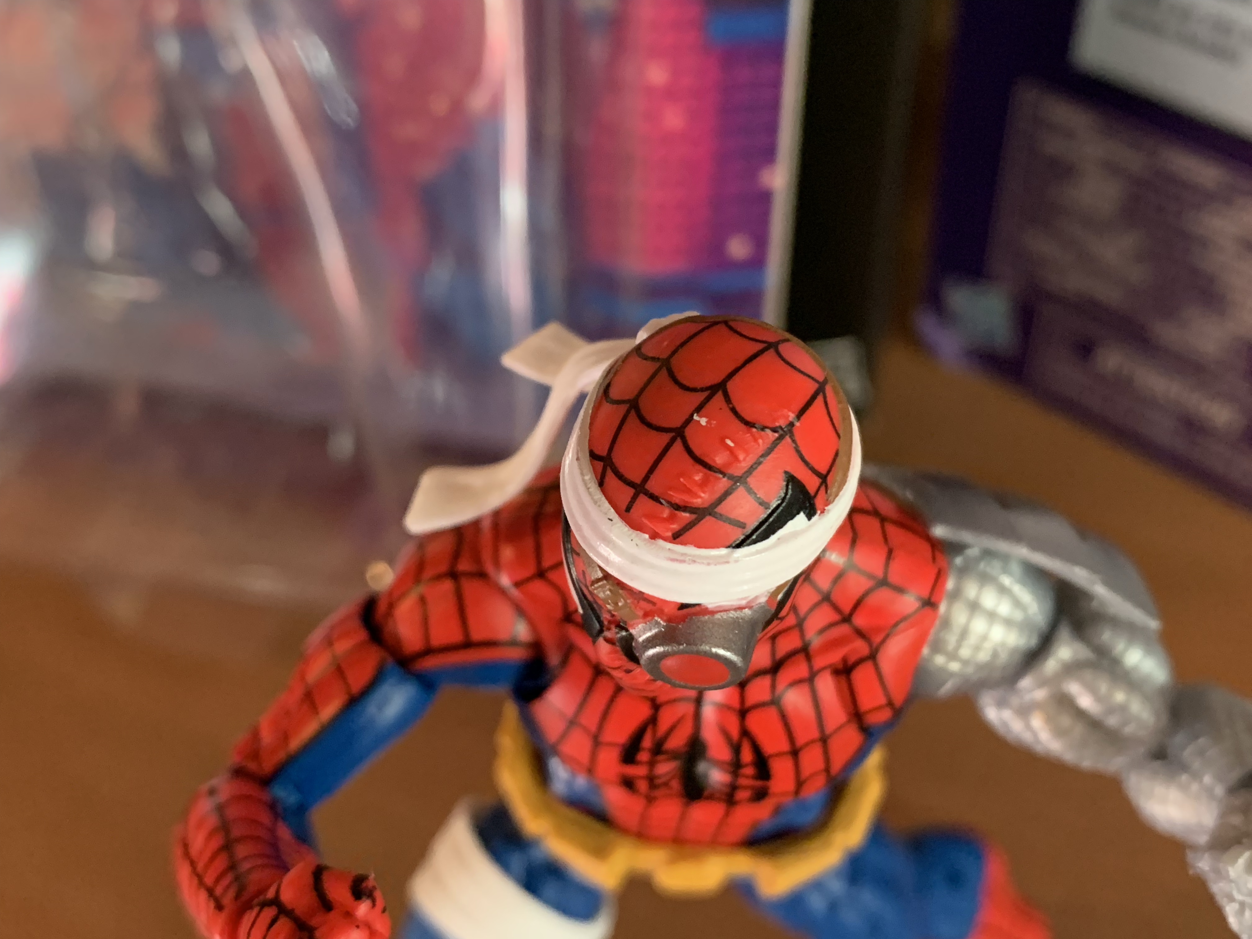 The articulation for this Spider-Man is not really it’s strong suit. I suppose we shouldn’t expect a cyborg version of the character to move as well as a traditional one, but I thought it would be a little better than this. The head is on the usual ball hinge which provides good enough range up and down, but not much nuance posing. The shoulders are ball-hinged and pretty limited out to the side. The left arm is hindered by the big plate on the shoulder, but even the right arm can’t quite hit a horizontal pose. There is a butterfly joint which provides more range going back than forward. It’s okay, but a bit ugly because the paint isn’t continued as far as the joint goes so you end up with gaps in the weblines on the front and the spider legs on the rear. The elbows are double-jointed on both arms and both can bend past 90 degrees. The cybernetic arm can even go further than the right arm as more plastic was cut away to make it work. The wrists rotate and hinge horizontally while the abdomen features a ratcheted ab crunch. It only allows one click back and one click forward so the range isn’t impressive. The waist twist is a waist twist and it is at least hidden by the belt because otherwise it would look pretty hideous. The legs can just about hit a split with a little effort, why newer figures can’t is a real mystery, while the legs kick forward to about horizontal with no range going back. We get the usual thigh cut and the double-jointed knees work just fine. There’s a boot swivel and the ankles hinge forward and back pretty far and feature a steep, but usable, ankle rocker. It’s nothing particularly impressive, but I don’t know what kind of posing most want to do with this guy. I tend to think he should be posed more like a brawler than the nimble Spider-Man of norm, but that could be just me. By Legends standards, it’s basically average.