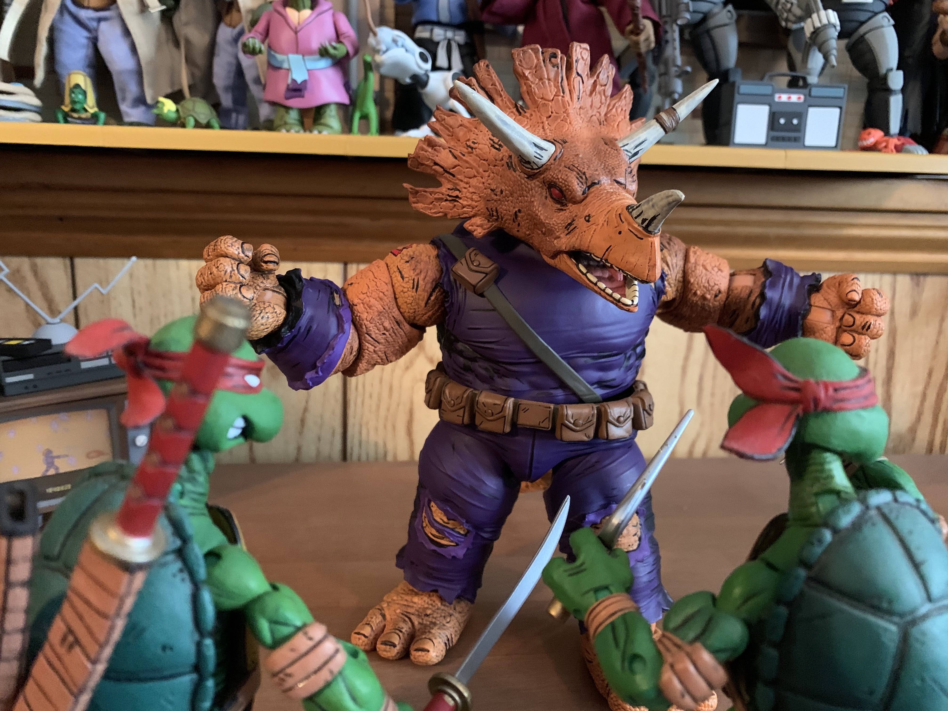 So just who is Zog? Well, he’s an alien dinosaur from the comics who is kind of an ally to the turtles. Not so much willingly, for you see, Earth’s air isn’t conducive to the Triceratons and when they don’t get the right concentration of whatever the air is on their planet they basically start to go insane. I think his brain is literally decaying in the comics to the point where he mistakes Raphael for a commanding officer. It was the Utrom who brought him unwillingly to Earth and he was able to escape to the sewers where he resides for about a year before coming into contact with Raph. By then, his clothing is tattered and so is his mind. The Utrom, being a common foe for the turtles and Zog, is basically a unifier, but a run-in with the Shredder clones ends Zog’s miserable existence prematurely. That makes it rather appropriate that he gets released at the same time as the clones, but if you’re familiar with TMNT, then you know Zog was just the start of the turtles’ involvement with the Triceratons. The interactions that followed tended to be less pleasant.