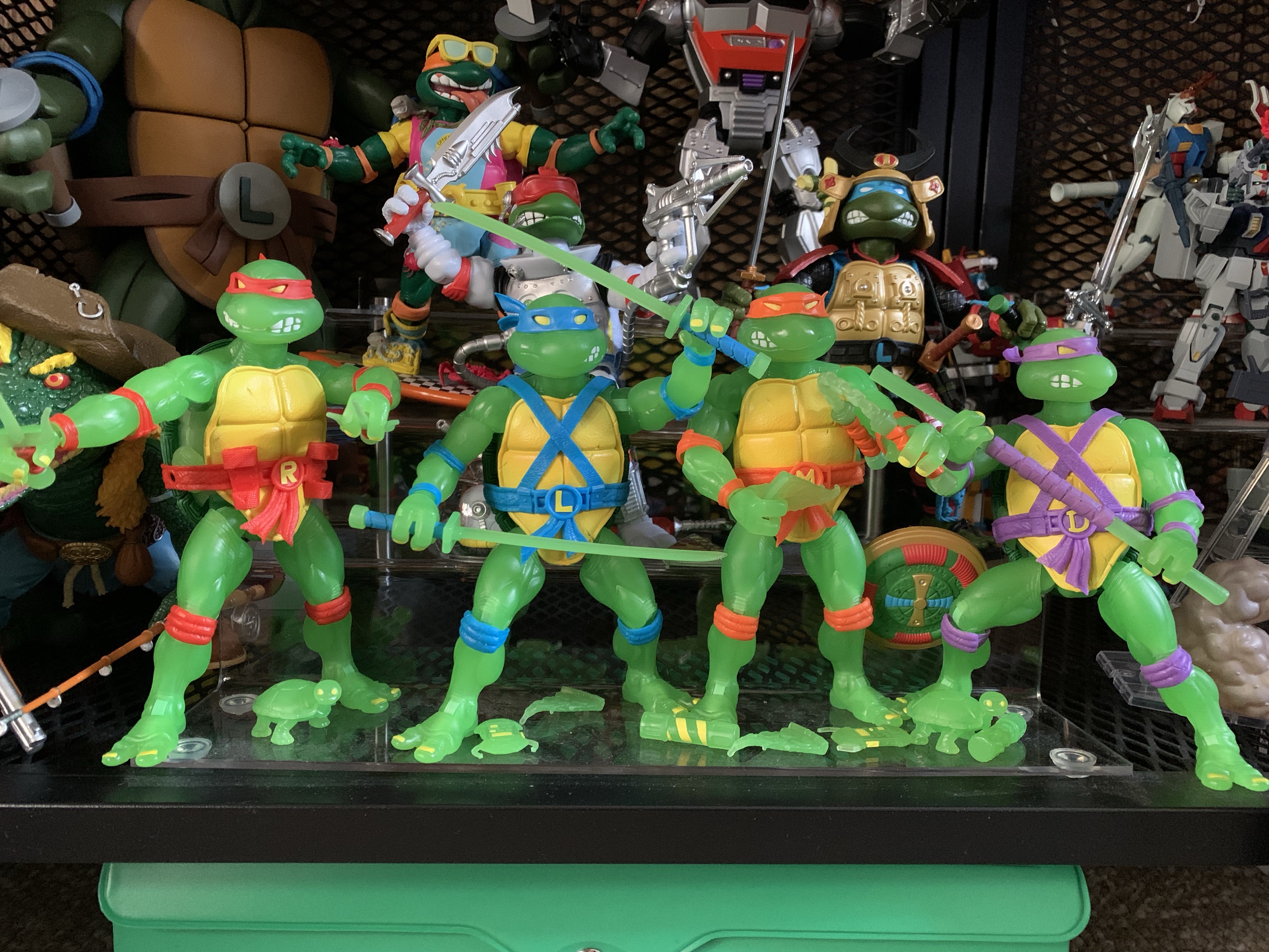 UPDATE – Due to a combination of store credits and clearance events, I was able to complete my set of Mutagen Ooze Turtles by adding Donatello, Raphael, and Michelangelo. I considered doing a review for each, but since each figure is essentially the same (and is already just a variant of figures I already reviewed) I figured a simple update was warranted. In short, if you like one of these then you’ll like all four. They come with the same accessories and hands and the only thing separating the figures is the unique weapon, head sculpts, and colored belts and pads. Pretty standard stuff.