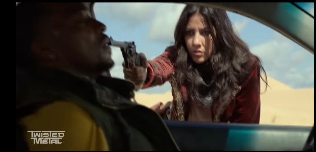Twisted Metal is set 20 years after the Apocalypse. The show doesn’t go into great detail about what happened, but essentially there was a massive failure in the power grid. I don’t know if it was a global catastrophe, or just related to the United States, but essentially everything went to Hell. Cities were sectioned off and the presumably wealthy and powerful remained inside the walled off municipalities while the rest of humanity was left to fight over the scraps. John Doe (Mackie) is a milk man. He basically does deliveries of various products between cities which makes him a target for vandals and such. It’s not an easy life, but it’s the only one he knows as he’s been doing it since he was a kid. He has no memory of his family or who he is, he just has a partially burnt picture to remind him of the life he once had.