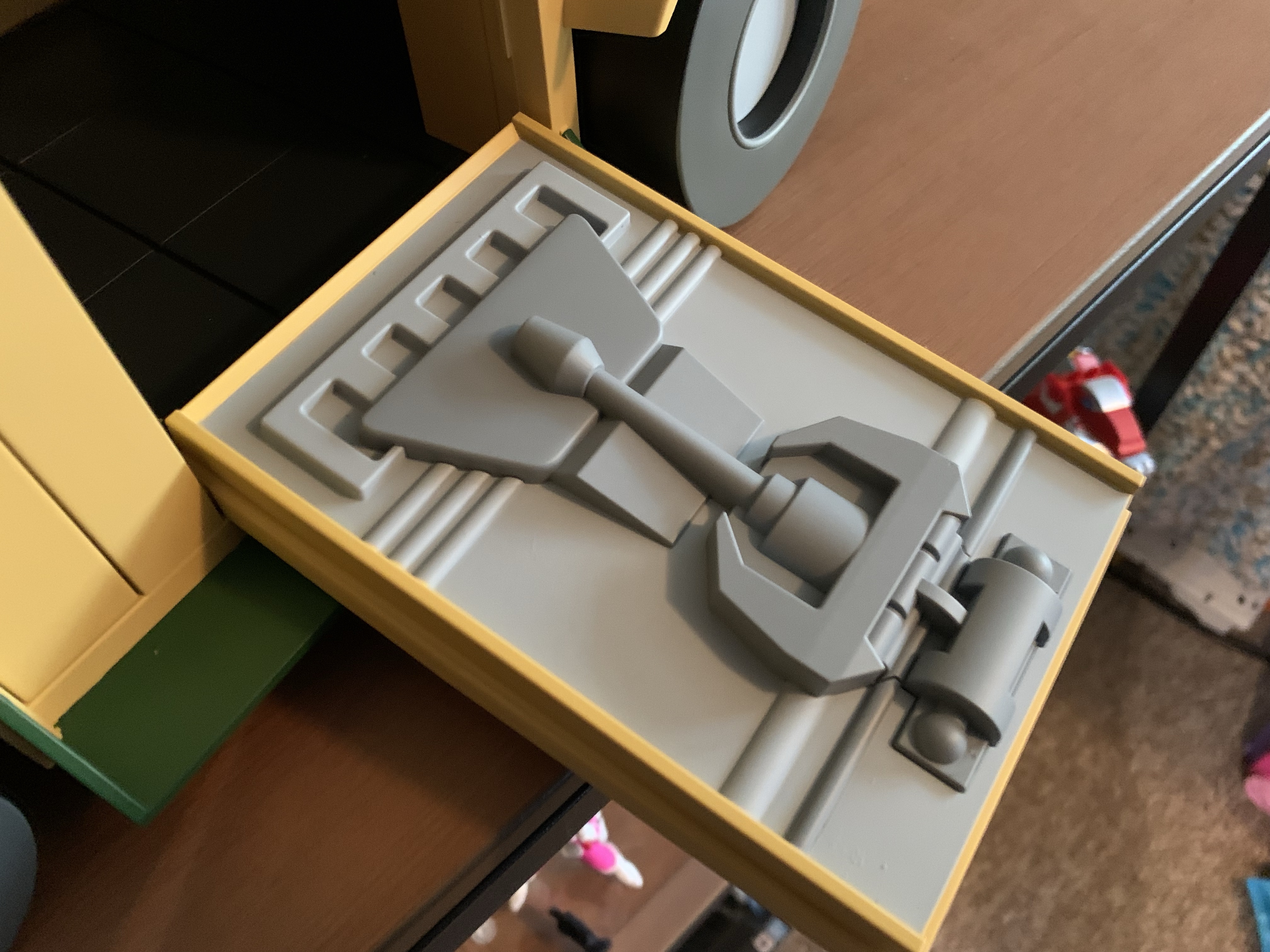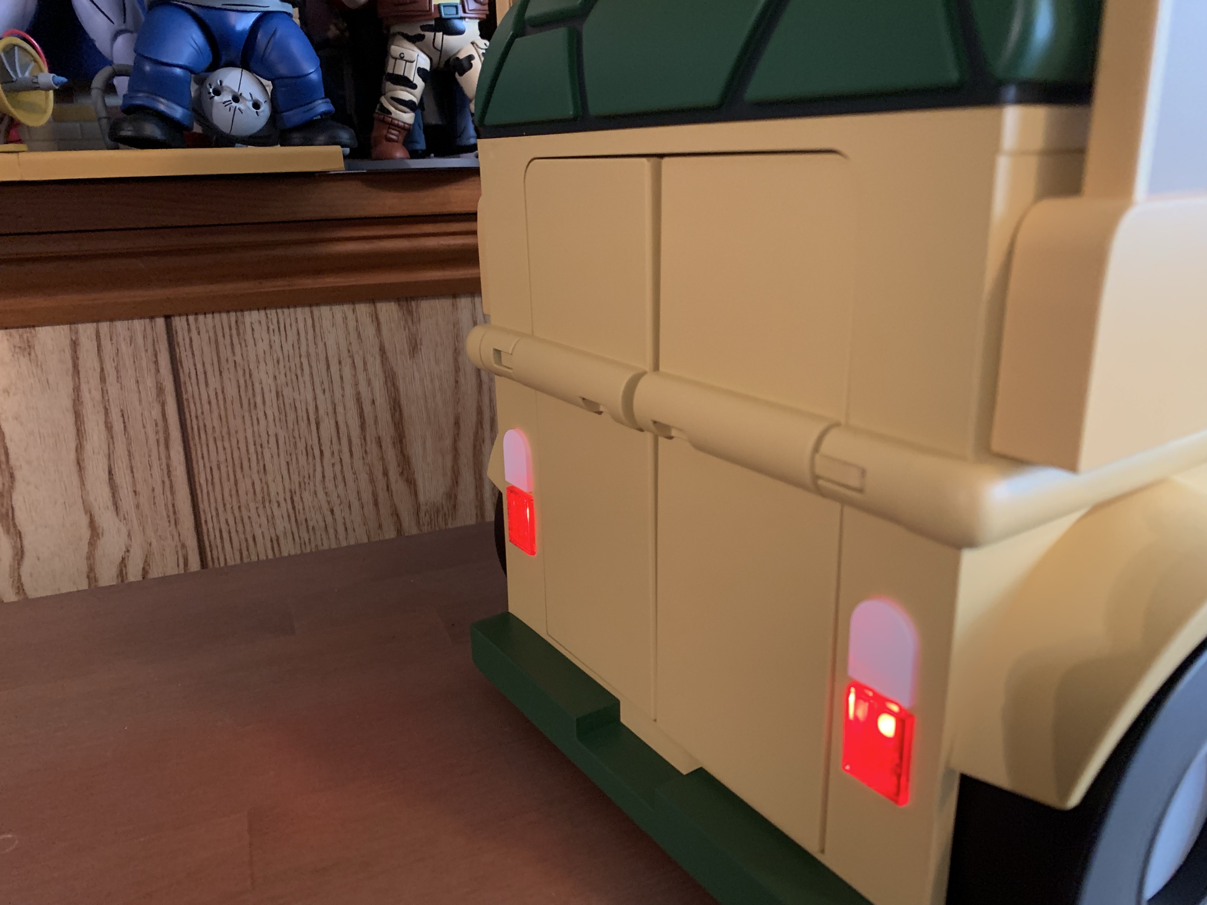 The Turtle Van comes in a giant box adorned with original artwork by Tim Lattie. The box itself measures 13″ x 17.25″ x 11.75″ and inside is a big clamshell held together by some tape. The van comes almost fully assembled, only the laser canons need to be inserted into the top, and there are no decals required. The van is approximately 7″ x 14″ x 11″ at the highest/widest points (excepting the canons). It’s a big vehicle and it will take up quite a bit of space wherever you plan to place it. The body is a matte, pale, yellow with a green bumper and roof. The tires are rubber with the inner rim a flat gray. All of the paint details in the bumper, on the tire cover on the front, and the roof look great. They are applied very well. The only paint imperfection I could find on mine is a tiny nick on the corner of the rear door. The windshield is transparent plastic or plexiglass as are the windows. The lights on the front and rear are LED lights which can be activated via a switch on the underside of the vehicle. There’s a dome light on the inside that sadly does not turn on as well. It very much looks the part and I really like how it turned out. The only critique I have is that the scale seems a touch off. It’s probably bigger than it should be and that seems most obvious when figures are placed in the front, bench, seat as they get kind of lost in this thing. I’m guessing the scale of the vehicle in the show wasn’t the most consistent, and it’s better to be too big than too small, but it is something I’ve noticed.