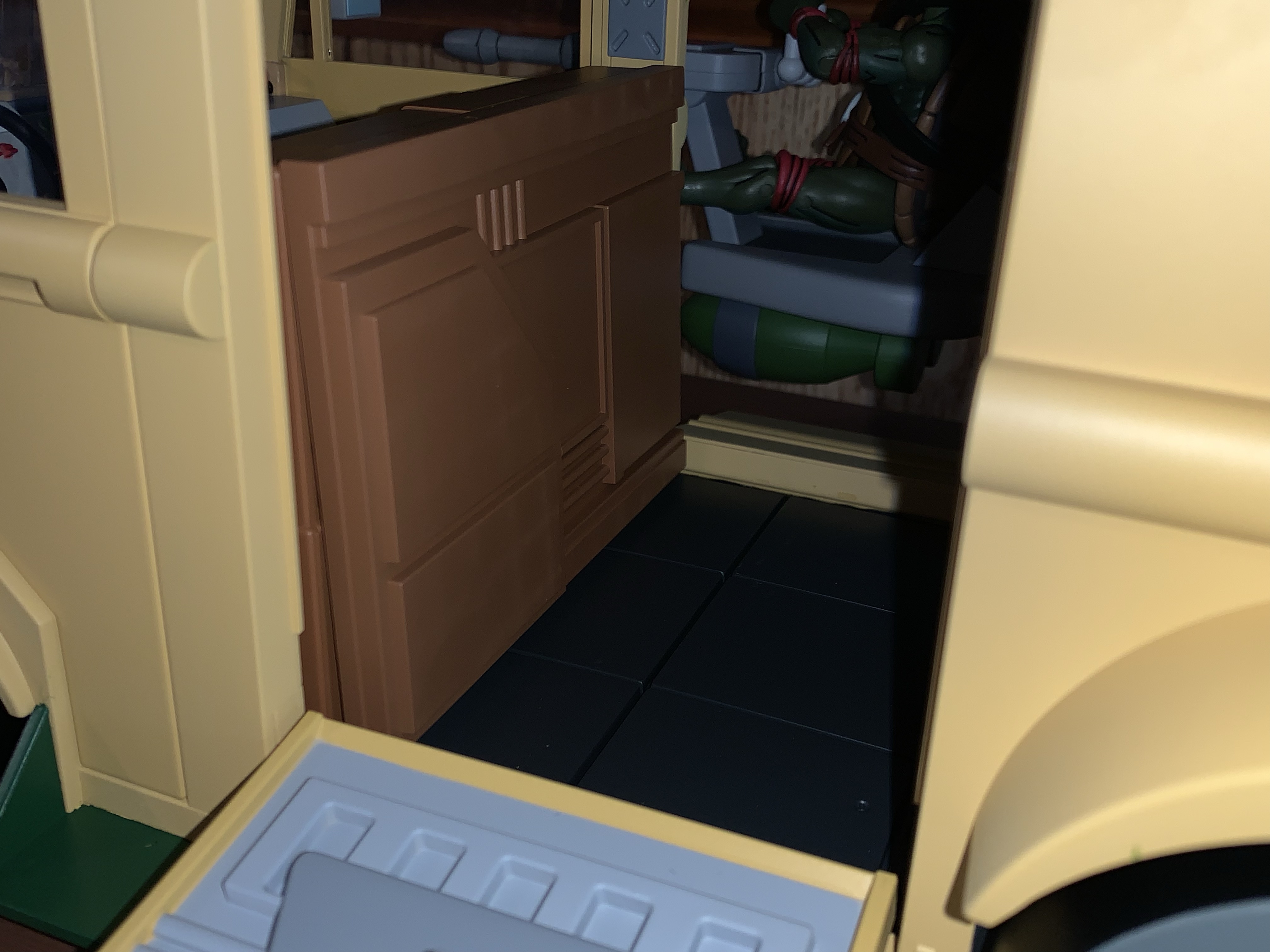 The Turtle Van has numerous features to it which help replicate how the vehicle behaves on TV. The roof opens up just like it did in the opening, though there’s nothing inside to launch them out. The interior has a bunch of generic electronics built into the walls so you can have Donatello messing around with stuff in there, though there aren’t any working levers or anything that intense. The driver’s side flips down to reveal a platform as it did on the show for Leonardo to take a stance and slice at some enemies. The opposite side swings open with a little half door below it that flips down similar to the Playmates version. For that side, there’s an included seat and laser canon that has to be snapped together, but then can be plugged in. By making it removable, it creates more space inside and I honestly can’t remember how often the turret showed up in the show after its first appearance. Sometimes, a collapsed version appears on the wall and NECA included what’s basically a plastic brick of the same which snaps onto the driver’s side platform.
