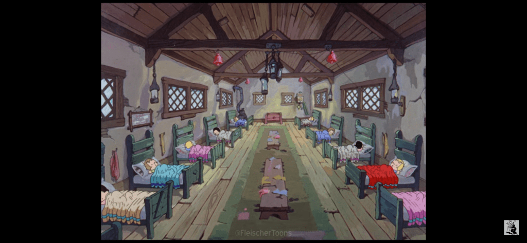 In the dormitory is where the children sleep. There are ten beds for ten sleeping orphans. Before I counted 14 stockings so I guess there will be some leftovers. They have a fairly generic design to them with round, cherub-like, heads and cheeks dressed in different colored nightgowns. They all have the same hair, for the most part, but they’re not all the same color. They are all little white kids which is bad for representation, but maybe good since so many of these 1930s Christmas shorts feature racist caricatures. Then again, most of those come from toys so we’re not out of the woods yet.