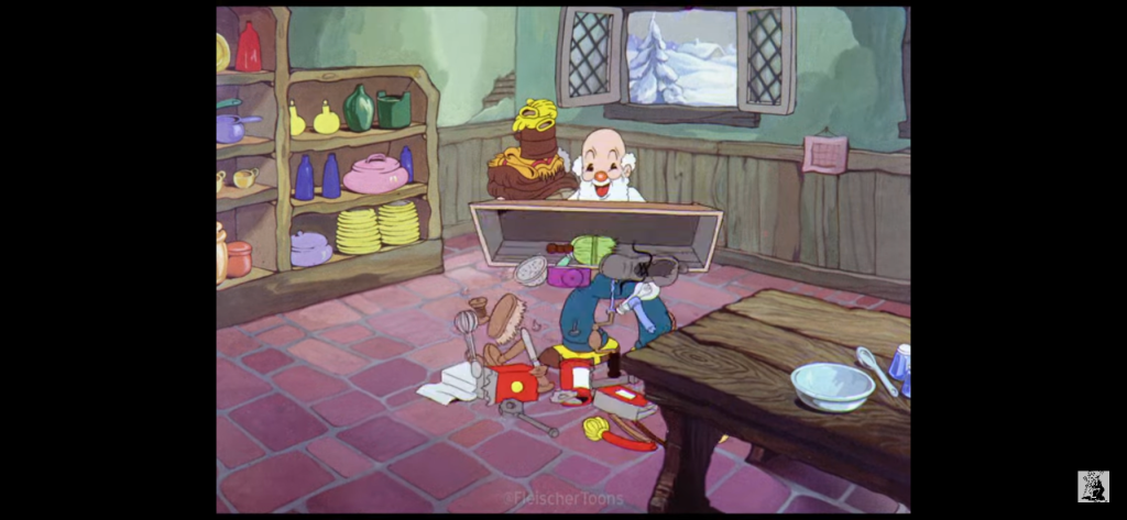 After creating the sleigh, he moves onto more toys. He turns a shade and some other junk into a toy plane, and since this is a cartoon, it really flies! A feather duster, alarm clock, sock, and some forks becomes a wind-up ostrich or something which walks right out of frame. The film then cuts to the pile of assorted junk as Grampy reaches for more and the pile gradually dissolves to indicate the passage of time with Grampy’s last creation a frying pan banjo. With a pile of toys now assembled, it’s time to distribute them, but first Grampy seems to think the place could do with a little sprucing up.