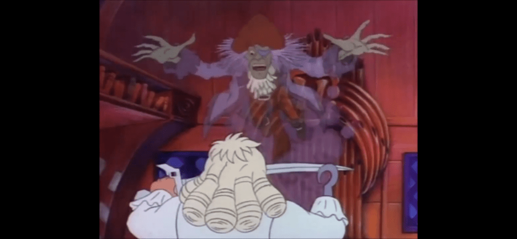 Before we can see the gruesome aftermath of this confrontation, Hook demands the spirit cease this vision. He then wakes up in his chair in a sweat with a look of distress upon his face that is soon replaced with his usual, grumpy, demeanor. He apparently believes that he did indeed see the past via the magic of some sort of spectre for he calls out to her in defiance. He taunts her by asking aloud if she thought she could really stir feelings of guilt and remorse within him over, as he terms it, relieving his brother of his eye. Apparently, he did not kill his brother that day, only maimed him. He takes a seat at his desk and begins to question if he really did see what he saw. As he settles down to read from a book, the voice of Smee calls out to him. This only further irritates Hook, who turns his head and sees a ghost version of his first mate. He correctly deduces that this is not really Smee, but another apparition, and the ghost confirms that he is indeed the Ghost of Christmas Present causing Hook to question if he is forever to be bedeviled by Christmas. Smee, which we’ll just refer to the ghost as such to make it easier, tells Hook that Christmas normally doesn’t concern itself with a villain such as he which enrages Hook for some reason as he shouts “blast your incorporeal hide!” The writing for Hook is just phenomenol. I normally am far too charmed by old VHS recordings to care much for quality, but in this case, I wish the audio quality were better on my source so I could properly make out every word this show has Tim Curry spit out. He is fantastic.