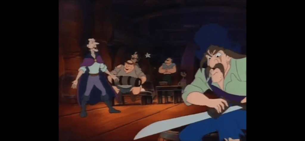 Hook then questions what’s the point of all this? Smee informs him that he just wants to show him that even bitter enemies lay down their arms on Christmas. Hook indicates he has no stomach for this “sentimental tripe,” which Smee says is unfortunate because he has more to show him. We’re then taken to the bowels of the Jolly Roger where the rest of the crew resides. The pirates are still sore from how Hook treated them and they seem to be ready to mutiny over it. As they draw their weapons, it’s Smee who pops in to declare they’ll be doing it over his dead body. He starts clashing swords with Mullins (Jack Angel) and tries to defend his captain’s honor. Hook remarks to the ghost Smee that he intends to put these jackanapes in their place, but the ghost tells him that’s not why he chose to show him this. Suddenly, the material version of Hook comes swaddling in demanding to know what’s going on. Smee informs him it’s a mutiny and Hook misunderstands him and seemingly thinks that Smee is declaring a mutiny, not trying to stop one. He picks Smee up by his shirt utilizing his hook while the little guy tries to tell him he had his best interests at heart. Hook puts him down seemingly understanding, only to double-down on his accusations by demanding Mullins chain Smee and toss him in the brig. As the first mate is hauled away he tells him this will be his last Christmas! This is really clumsy considering this is supposed to be the present, but it features Hook! Why didn’t we see this earlier?