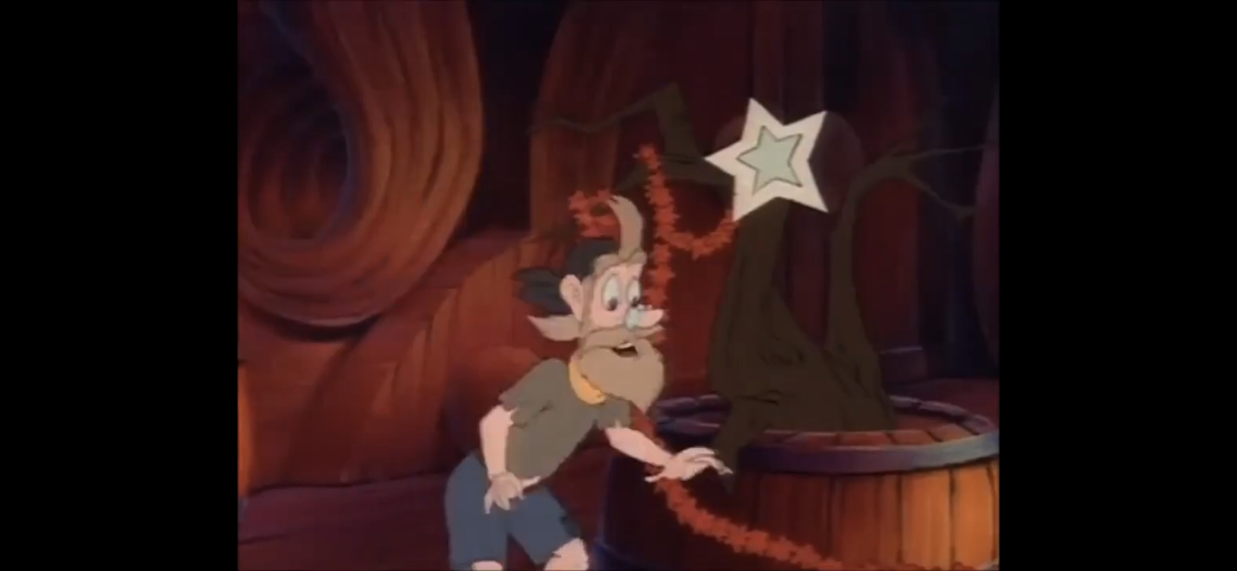 Before we can see the gruesome aftermath of this confrontation, Hook demands the spirit cease this vision. He then wakes up in his chair in a sweat with a look of distress upon his face that is soon replaced with his usual, grumpy, demeanor. He apparently believes that he did indeed see the past via the magic of some sort of spectre for he calls out to her in defiance. He taunts her by asking aloud if she thought she could really stir feelings of guilt and remorse within him over, as he terms it, relieving his brother of his eye. Apparently, he did not kill his brother that day, only maimed him. He takes a seat at his desk and begins to question if he really did see what he saw. As he settles down to read from a book, the voice of Smee calls out to him. This only further irritates Hook, who turns his head and sees a ghost version of his first mate. He correctly deduces that this is not really Smee, but another apparition, and the ghost confirms that he is indeed the Ghost of Christmas Present causing Hook to question if he is forever to be bedeviled by Christmas. Smee, which we’ll just refer to the ghost as such to make it easier, tells Hook that Christmas normally doesn’t concern itself with a villain such as he which enrages Hook for some reason as he shouts “blast your incorporeal hide!” The writing for Hook is just phenomenol. I normally am far too charmed by old VHS recordings to care much for quality, but in this case, I wish the audio quality were better on my source so I could properly make out every word this show has Tim Curry spit out. He is fantastic.