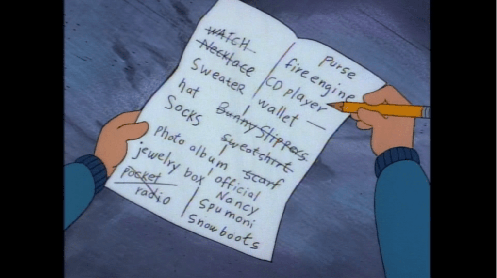 The first stop on the shopping spree is a store called Budnick’s. Is this a reference to another Nickelodeon show? Maybe, or maybe it’s a coincidence, but I’m going to go with “yes” because it makes me happy. Before we can get a glimpse at this list though, we first need to check-in with Helga. She’s contemplating a skateboard for Arnold and talking up the gift to herself to the point where it seems like she’s found the perfect gift. Then another kid pops up, Stinky (Christopher Walberg), to tell Helga that it is a great gift. How does he know? Because Arnold has one just like it! The kid’s a bit odd as he’s tall and gangly and actually steps over the display of skateboards to enthusiastically tell Helga all about it. A dismayed Helga returns the skateboard to the rack and slinks off, but hey, at least she didn’t get Arnold something he already had!