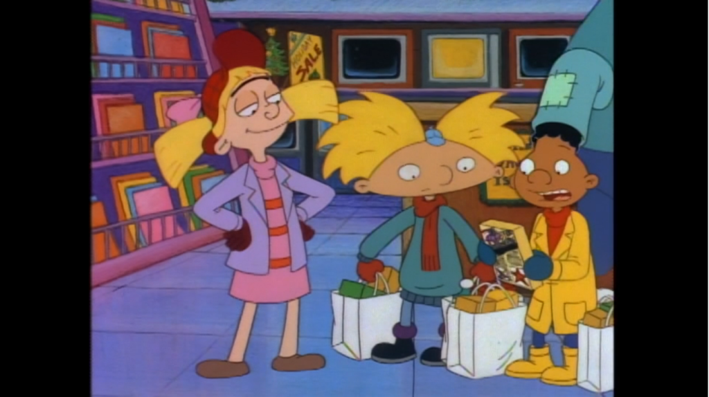 We cut back to Helga who has, once again, found the perfect gift for her beloved Arnold. It’s some video game called The Frozen Tundra Death Warrior 7000! It doesn’t sound like the sort of thing Arnold would like, but what do I know? Helga disagrees as she thinks it’s flashy and something Arnold will be delighted to find underneath his Christmas tree. As she convinces herself of the gift’s majesty, she vocalizes her desires and wishes which include an admission of love for Arnold and the hope that this gift will inspire him to feel the same way about her as she does him. She even declares that this must be the truest meaning of Christmas. Worth noting, the price tag on this game is 100 bucks so Helga is really throwing some coin around to impress Arnold. As she clutches the game to her chest, she’s startled when she turns around to spy Arnold and Gerald on their mission for those fancy snow boots. She quickly hides the game behind her back. She addresses the pair in her usual bully fashion, referring to Arnold as football head and Gerald as tall hair boy (she’s very creative). She pokes fun at them for their last minute shopping, but when Arnold asks what she’s shopping for she’s happy to whip out the video game. She boasts how anyone receiving that for a gift would be really impressed, but Gerald takes a look at it and corrects her by noting it’s expensive and flashy, but not exactly personal. Apparently he really did take Arnold’s message to heart when it came to gift giving. Helga basically has a defeated look on her face as Gerald hands the game back with a “No offense,” that likely doesn’t help salve her wounds.