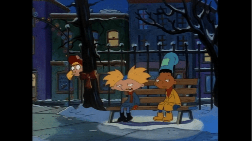 I say I experienced Hey Arnold! largely through osmosis because it was never a show I sought out. My sister liked it and if I was using our family computer it meant she had control of the television in the same room so that’s how I saw a lot of this period of Nickelodeon. I don’t know how much of the show I saw. I certainly saw enough to know who Arnold was and who his best friend was. I knew Helga was the school bully with a bad homelife who harbored a secret crush for little football head. I knew Arnold didn’t have parents, but I don’t know if it was ever explained why. And I knew the show had a Christmas episode in its first season. It’s one of the few episodes I can recall with any specificity as it was surprising in how moving it was. I say surprising, but for anyone who watched the show regularly, I don’t think it was. For me coming at it as just another Nicktoon, I wasn’t expecting to be moved to tears by its resolution. Because it wasn’t a favorite show of mine, I kind of lost track of it resulting in “Arnold’s Christmas” being something close to a one and done for me as opposed to an annual viewing. When I compiled my updated list of the 25 best Christmas specials, it was one I considered, but ultimately declined to include. Consider this entry a re-appraisal of “Arnold’s Christmas” as I know many people younger than me absolutely consider it among the best of the best and likely the best Christmas special produced by Nickelodeon.