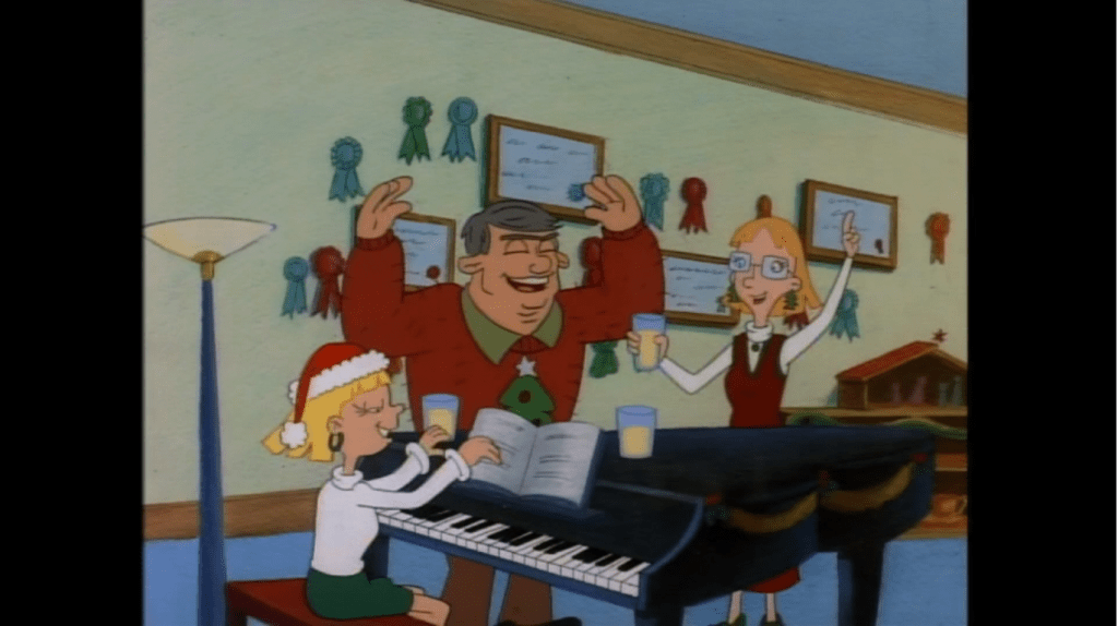 At the Pataki house, Helga’s family is belting out their own drunken rendition of “Jingle Bells.” The thing with Helga’s mom (Kath Soucie) is she’s always shown drinking something in the show, usually coffee, but her mannerisms imply she’s basically drunk. And here, she seems to be drinking eggnog. Actually, it’s quickly confirmed to be eggnog. Basically, she’s an alcoholic, but the show must not have been allowed to spell it out so plainly so they have to tiptoe around it. Her father, Bob (LaMarche), is just a boisterous asshole who pays no attention to Helga and both parents are far more invested in Helga’s older sister, Olga, who they view as the golden child. Helga comes into the house with her shoulders slumped as she heads into the living room and collapses on the couch. Her mom comes over and asks where she’s been all day and Helga replies curtly, “Out, Miriam.” She always addresses her parents by name as she seems to think they aren’t worthy of being called mom and dad. Miriam does note that her daughter looks depressed, but doesn’t actually ask her anything or attempt to investigate why. Instead, she just hands over a Christmas present. Helga opens the box and finds one of the things she had been longing for: Official Nancy Spumoni Signature Snow Boots! She immediately brightens up while her mom tries to tell her how long she had to wait in line just to get them.
