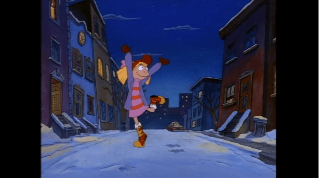 Arnold then confesses to Gerald that he basically can’t believe this happened and questions how it could have? Gerald just matter-of-factly declares it a miracle, the one Arnold had been counting on, and there’s really no explaining a miracle. He then suggests that maybe Arnold has a Christmas angel looking out for him, and Arnold almost seems receptive to the idea. We’re then shown through the window that Helga is standing in the street looking on. She’s in her socks too, so she apparently did end up surrendering those boots to Mr. Bailey, as expected. She looks happy though and nearly overcome with emotion as she whispers softly to herself, “Merry Christmas, Arnold.”