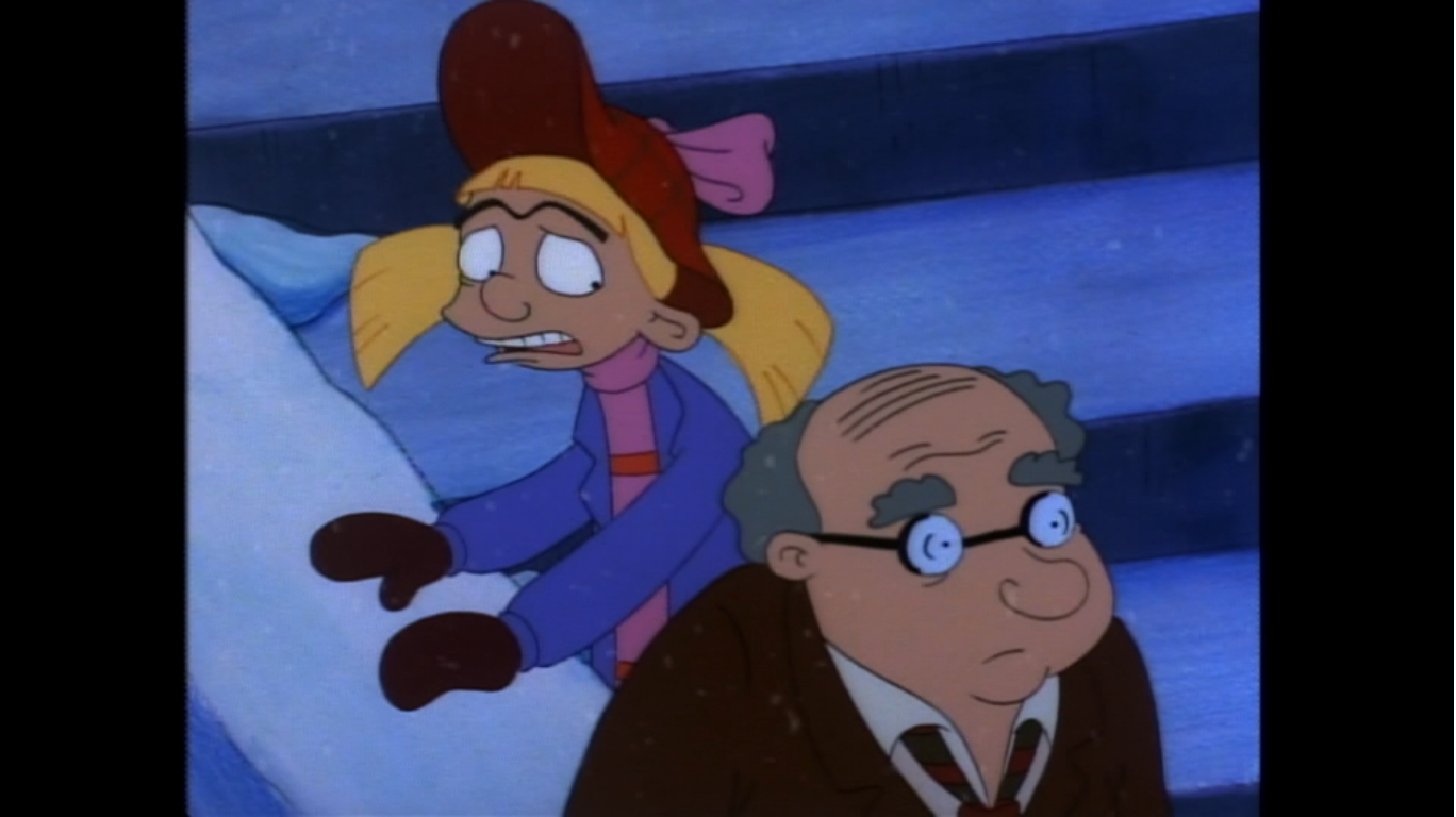 Like many Christmas episodes, this one foregoes the usual opening title for a more festive one. We see many scenes of kids playing in the snow and some of the tenants of the apartment building are skating over frozen streets. There’s an Arnold-shaped snowman and the whole sequence is set to an original instrumental by series composer Jim Lang that sounds vaguely “Christmas” without actually sourcing some public domain music. As the music fades out, we see the kids running in the street and the camera soon finds Helga (Francesca Marie Smith) walking on a sidewalk with her only friend, Phoebe (Anndi McAfee). Phoebe is delighted by the presence of Christmas all around them, but when she asks Helga what she likes best about this time of year she gets the very Helga response of “Presents, dummy!” Well, not exactly, but that’s her tone as she details her feelings on the holiday which can be distilled to getting as much stuff as possible before it’s all over.