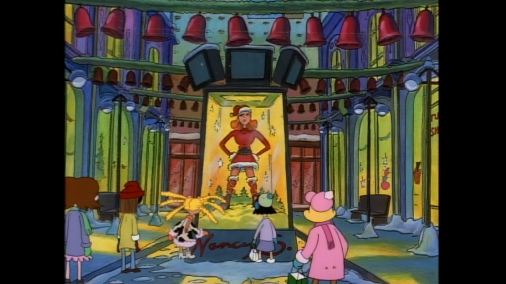 Soon, Helga’s gaze finds a store display advertising Nancy Spumoni snow boots.This is apparently her version of the Red Ryder BB gun as she details all of the features of the boots as she circles the display practically drooling over them. Another kid, Rhonda (Olivia Hack), chimes in to remind Helga that this is the hot item basically all of the girls their age wants this year and they’re hard to come by. Helga dismisses her take as she’s feeling confident she’ll get what she wants this year. And if she doesn’t, it sounds like she intends to make sure her parents pay somehow. Possibly physically.