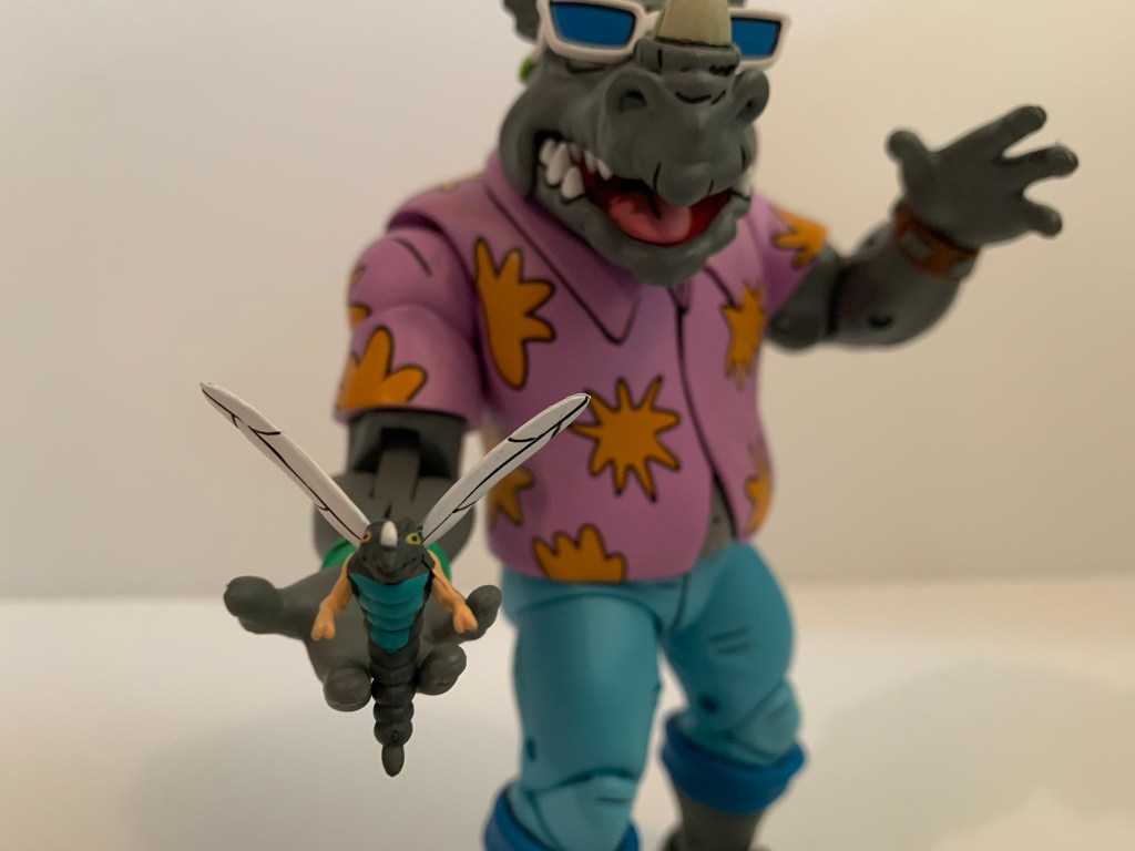 These two come with an assortment of hands and vacation accessories. For both, we get a set of fists, gripping, and open hands. Rocksteady comes with a lei around his neck while Bebop has a satchel. Both also have a camera with a strap on it. Rocksteady’s features a large flash while Bebop’s is more compact. Unfortunately, neither can really be held as they’re too chunky for the gripping hands. You could heat them to wedge it in, but then you risk rubbing the paint. Plus, it’s unlikely they’d be able to hold the cameras in front of their face like they’re using it. There’s a large, blue, canister that looks like a water jug, but it might be some mutagen thing from the episode. I didn’t rewatch it. Unlike the cameras, the pair have no issues holding this thing by the handle. Lastly, we get a little rhino-fly. In the episode, a dragonfly has contact with Rocksteady and then contact with the mutagen to become this gross, little, abomination. It’s a fun little inclusion, though I wish he had a little acrylic stand or something because he really can’t do anything by himself. He basically needs to be held.