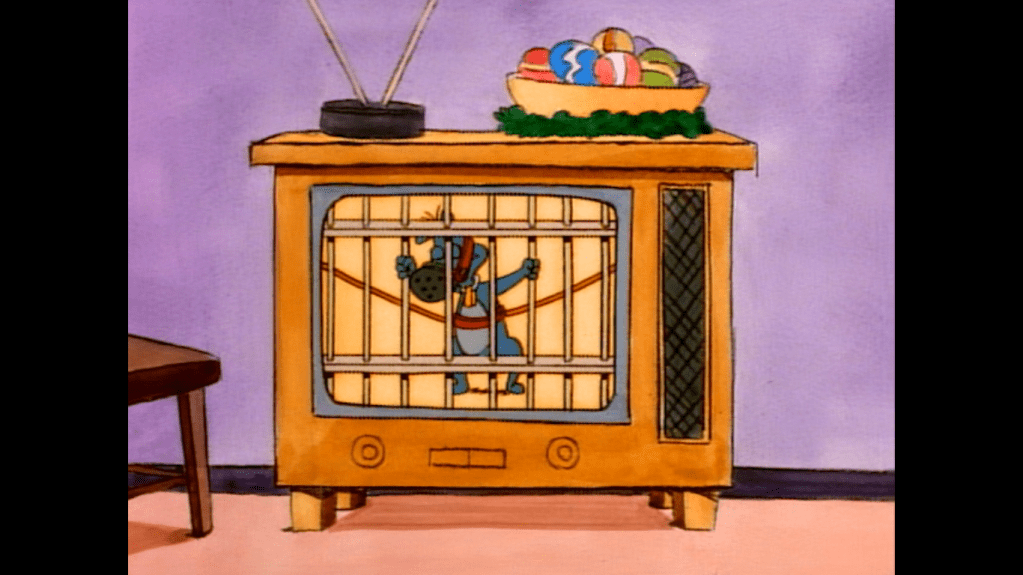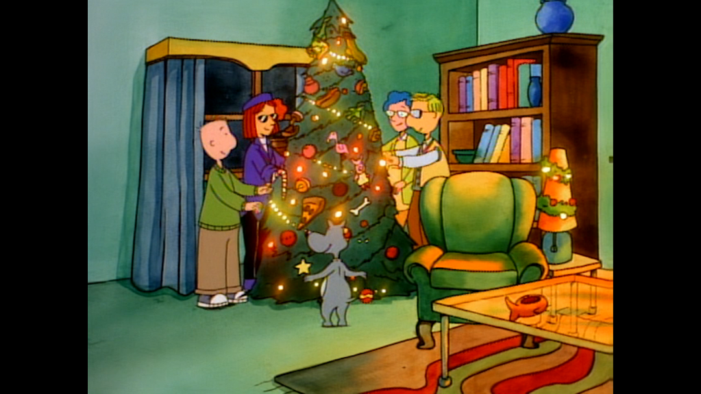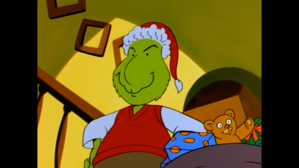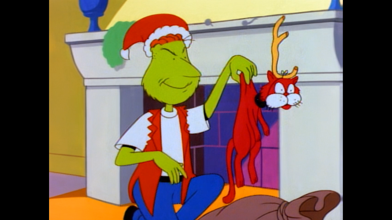 That’s because it’s a Grinch parody! There’s a narrator (sounds like Doug’s dad, Doug Preis) speaking in rhyme as a shadowy figure with an animal companion descends Doug’s chimney. It’s Roger (Chris Phillips), the town bully, only he resembles the Grinch. And with him is his cat Stinky who has a lone antler atop her head a-la Max. He’s here to steal Doug’s Christmas, only there’s a problem: it’s already been stolen! He looks around and finds no tree or decorations of any kind. The interior of the house is drawn and colored to resemble a home from the classic television special and the creative team a pretty nice job. When Roger-Grinch looks around to find out who stole Christmas first, it’s revealed to be Doug himself! He’s all grinchified as well and we fade to black on this shocking revelation!