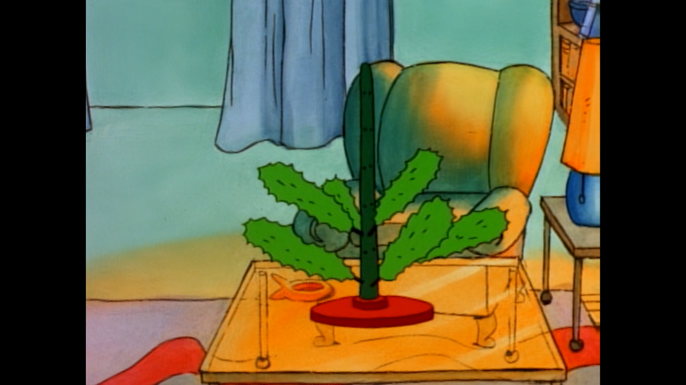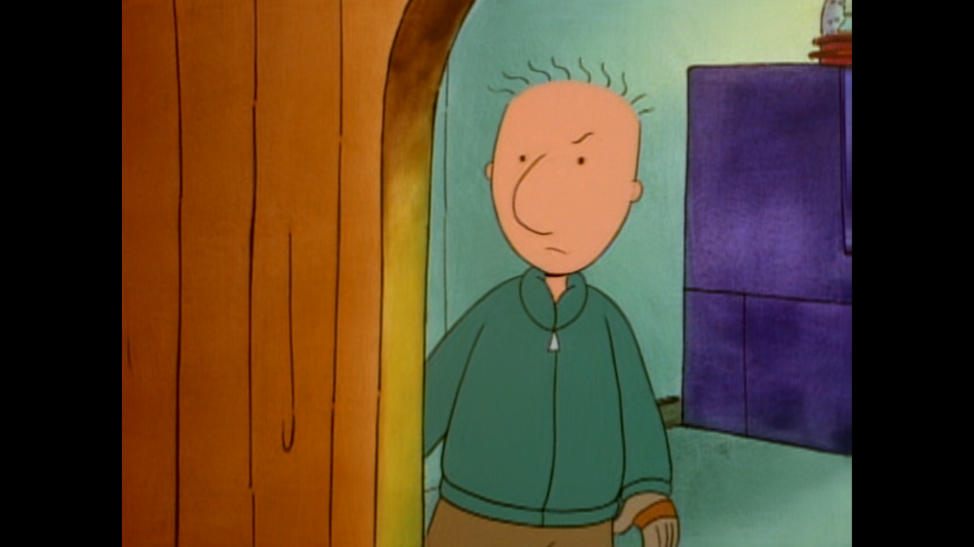 We next check-in with Doug as he’s heading home. On the way, he stops by the tree lot of one Mr. Chestnut (I’m not sure who is doing his voice, the credits on this show are terrible) who apparently knows him from last year or does something else in town the rest of the year that puts him in contact with Doug. He speaks with a southern drawl and remarks that Doug got his best tree last year (he probably says that to all of his customers) and asks what’s he going with this year? Doug tells him he’s just stopping by and will come back with his dad in a little bit to get a tree. As he walks home, he imagines he and his family decorating the perfect tree. Only when Doug gets home he doesn’t find a family waiting to go grab a new tree and instead spies some little, tabletop, half-finished tree. Doug can barely speak he’s so shocked as his dad explains that, with the baby coming, he didn’t see any reason to make a big fuss out of the tree. He hands Doug what I assume are the instructions to finish setting up the tree as he and his mom leave for some birthing classes leaving Doug all alone to construct this monstrosity.