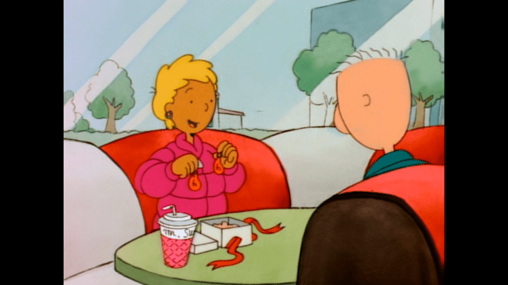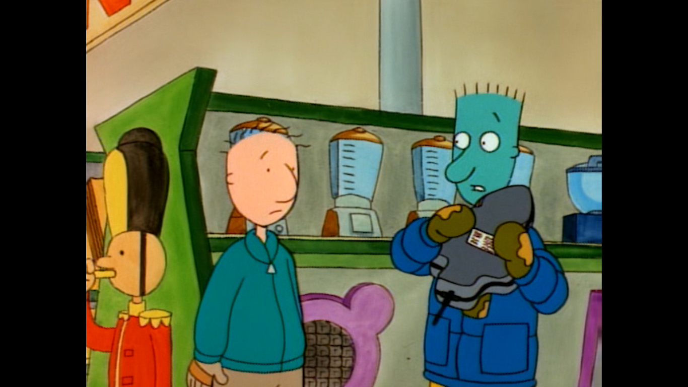 After school, Doug and Skeeter engage in what Doug describes as traditional last minute shopping at the mall. Doug is looking for a gift for Patti (Constance Shulman), the girl he longs for, but he can’t find anything he likes. Skeeter, on the other hand, has his eyes on a Christmas Tree waffle iron. Apparently, his dad would make the family tree-shaped waffles ever Christmas, until Skeeter used it to create a bunch of trees for a diorama. The waffle iron did not survive the battle, as he puts it. He wants to get this one for his dad, but he doesn’t have the funds. Doug happily offers up his money, though we don’t hear any specifics which is probably smart as it will help keep the episode timeless, to a degree. Even though they’re shopping at a mall, which is pretty dated in some parts of the world. Skeeter is delighted and vows to pay Doug back as soon as he can, only there’s one problem now.