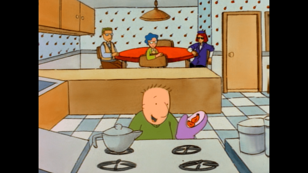 Doug sets out to seemingly discuss this list with others in the house. As he does, we see his mom and sister (both voiced by Becca Lish) go over breathing exercises in the living room. Apparently, Doug’s mom is pregnant and the baby is expected in about a month. I think that has been a season long arc for the Funnie family. In the den, Doug finds his dad (Doug Preis) who has something on his mind. Doug wants to talk presents, but dad would like to have a man-to-man conversation that he’s been putting off. He picks up a book which is all about the old birds and the bees. Apparently, Mr. Funnie would like to talk about how he and his mom made this new sibling that’s about to enter their lives. He reads from the book and doesn’t even insert Doug’s name where he’s supposed to instead just saying “Blank’s Name.” Doug stops him before things can get any worse and lets his dad know he’s learned all of this in school already. Doug even gladly explains what sex is (he’s even allowed to say the word), but the audio drops and there’s a clear indication of time passing. The two emerge from the den with Doug’s dad sheepishly rubbing his head and thanking his son for the lesson adding they left some stuff out when he was in school. Poor Mrs. Funnie…