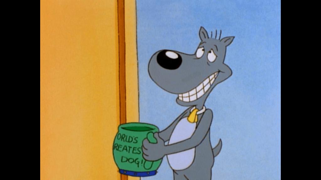 It’s on the way home from the tree lot that Doug and Porkchop vow to have their own, secret, Christmas. They setup the tree in Doug’s room and exchange gifts on Christmas morning. Porkchop got Doug another journal (he can always use more of those) while Doug gifted Porkchop a world’s best dog mug. I can’t tell if he likes it. Doug then turns on the radio and tries to stay positive as we hear a Christmas song which the DJ announces is a dedication to Doug Funnie from his pal…Doug Funnie. Okay, now this is starting to get sad.