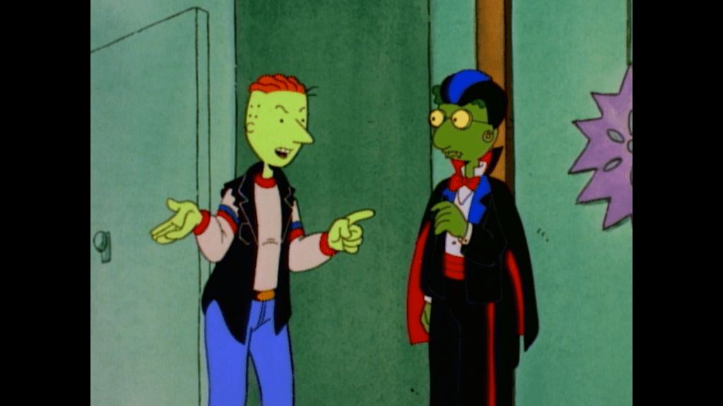 And of course, Doug is going to get a happy ending. The Funnie family hosts a Christmas party at their house, it’s just a few days late. A lot of people seem to show up, including Skeeter’s family. His dad thanks Doug for the waffle iron, while Roger and Fentruck resume this runner about Yakistonian Christmas. Fentruck, dressed as a vampire, is listening to Roger explain Halloween. When he then explains what Christmas is, Fentruck basically tells him that’s Yakistonian Easter. Roger just drops to the floor and starts throwing a tantrum. Let’s move on.