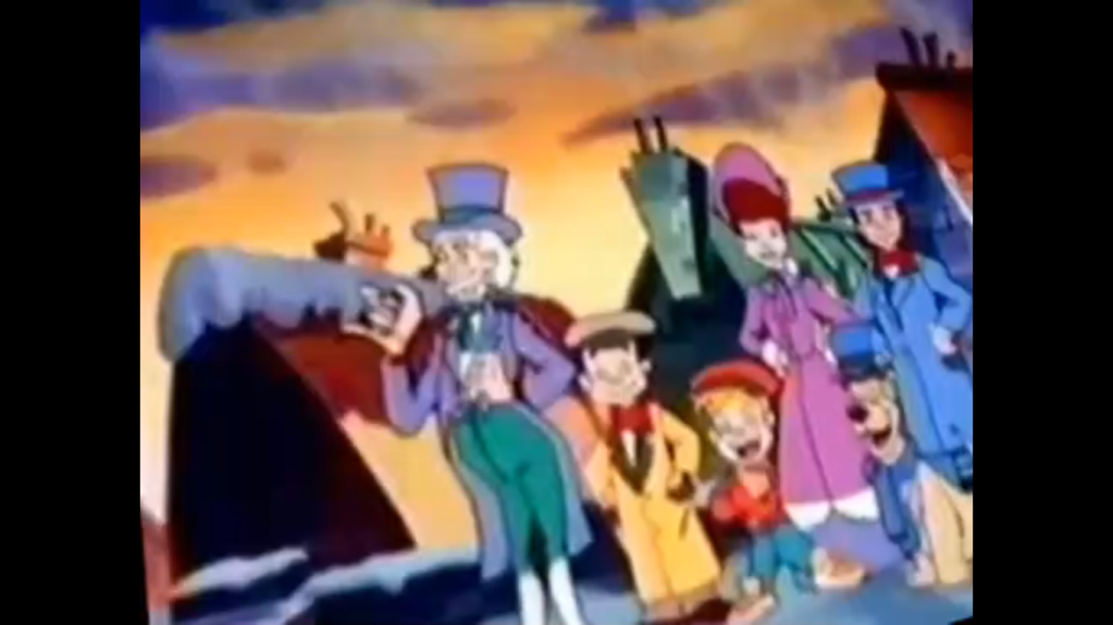 Now that all of the wrongs have been righted, it’s time for a merry Christmas! The Brown family (and Marty) are celebrating with the toy store owners. Reggie has been adopted by them and he’ll be able to work in the store now. As for the poor, downtrodden, family that had nothing but a few chestnuts to eat, well, we don’t know. I guess they’re still in the gutter because they are no where to be found. Everyone seems happy though, and even Tannen comes barging in with a Christmas goose, but upon seeing Marty he realizes he’s been tricked. Marty runs and Tannen gives chase only to collide with a cart full of figgy pudding (I guess we can’t do manure jokes on Saturday morning network television) and is left laying in the street. The carolers return to basically tells us what happened and Tannen ends it by saying he hates it, it being the pudding he’s covered in. Or Christmas. Or both! I would have thought he was going to say “Bah! Humbug!” but maybe that was too obvious? The camera pans to the sky where the DeLorean is passing by. Doc gets to finish the song by singing “And a happy new year,” only for Verne to correct him that it’s actually an old year. “Not for long,” cries his dad as the DeLorean jumps forward in time, back to the future!