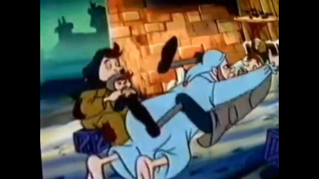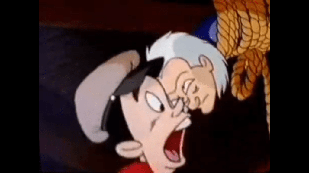 We catch-up with the boys who find themselves in a dark alley. They spy the kid who swiped the watch as he’s heading up a long, rickety, staircase into a dilapidated looking building. The kids race up there, but are soon met by a bearded fellow named Murdock who seems eager to dispose of them. After an act break, we find the boys suspended upside down and bound with rope. The kid who stole the watch seems sympathetic to them while his boss suggests he’s going to dispose of them. The thief thinks maybe these boys could be pickpockets like him, but Verne gives him a “No way, Jose,” channeling his inner Michelle Tanner at the mere thought of being a crook. It takes his brother to remind him that going along with such a thing may get them the watch back. If he’s trying to be discreet he’s doing an awful job, but Murdock appears to not overhear. He asks the two if they’ve ever stolen anything before and Verne just responds with, “Cookies!”