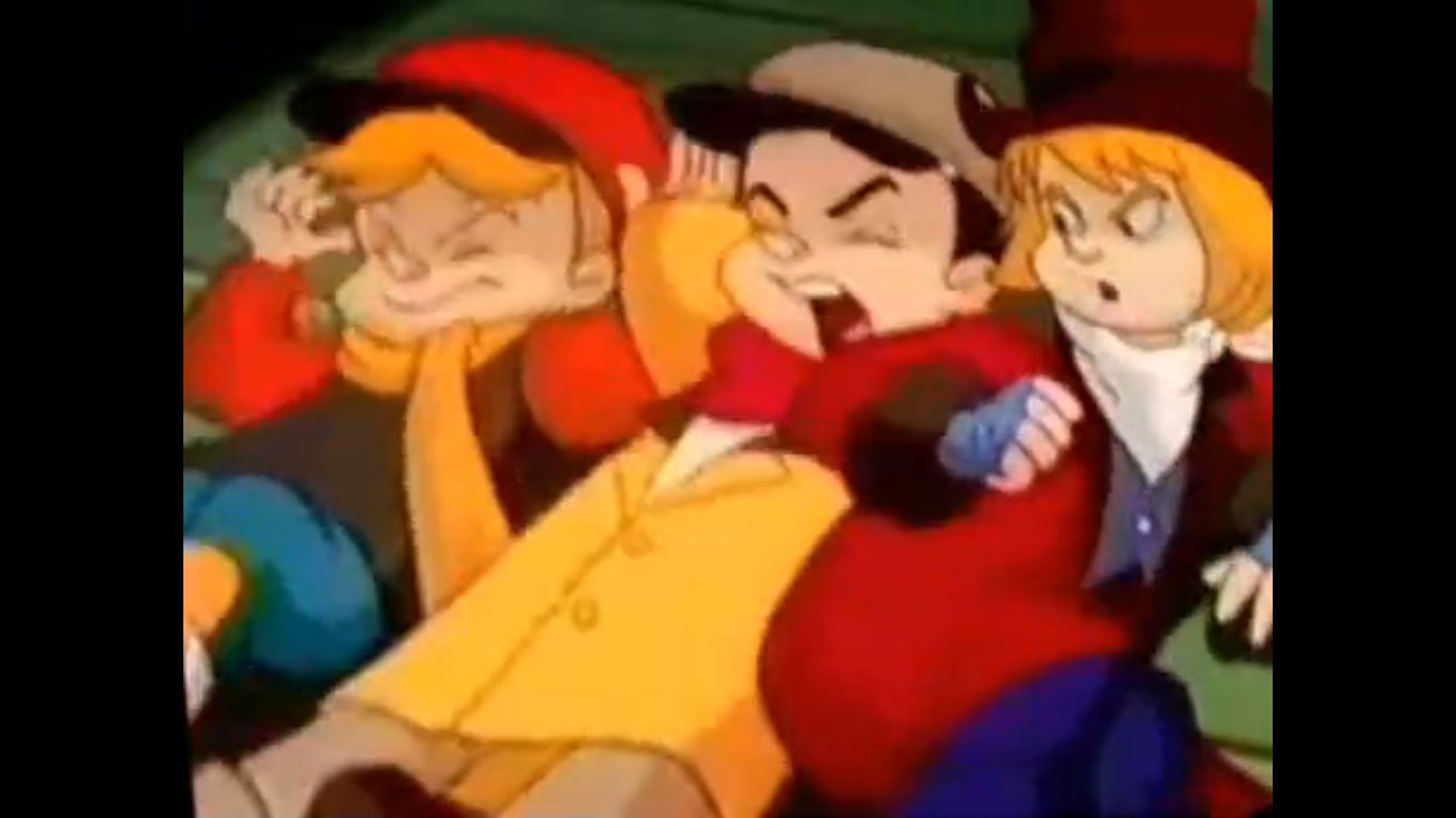We catch-up with the boys who find themselves in a dark alley. They spy the kid who swiped the watch as he’s heading up a long, rickety, staircase into a dilapidated looking building. The kids race up there, but are soon met by a bearded fellow named Murdock who seems eager to dispose of them. After an act break, we find the boys suspended upside down and bound with rope. The kid who stole the watch seems sympathetic to them while his boss suggests he’s going to dispose of them. The thief thinks maybe these boys could be pickpockets like him, but Verne gives him a “No way, Jose,” channeling his inner Michelle Tanner at the mere thought of being a crook. It takes his brother to remind him that going along with such a thing may get them the watch back. If he’s trying to be discreet he’s doing an awful job, but Murdock appears to not overhear. He asks the two if they’ve ever stolen anything before and Verne just responds with, “Cookies!”