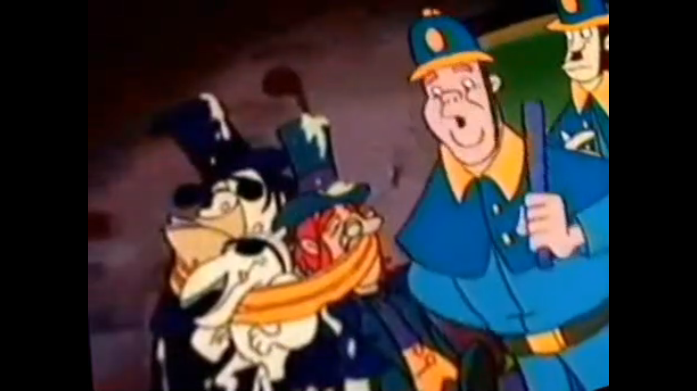 Doc and the boys are seen running through the streets with the bad guys hot on their heels. They happen upon the Hog’s Head, once again, only to find it closed. That doesn’t stop them from barging in and when the maid cleaning up the place objects, Doc just hands over a wad of cash to “Cover the damage he’s about to do.” They run off into the tavern while Murdock and Wilkins arrive. The maid is further angered to see more people as Doc taunts them from…the ceiling? Oh yes, those magnetic anti-gravity shoes or whatever they were called just had to reappear. Doc is on the ceiling and preparing to give these scallywags a lesson on Newton’s first law of motion: A body at rest will remain at rest while a body in motion will remain in motion. Doc then unleashes a bunch of pickle barrels from the ceiling which collide with Murdock and Wilkins. The resulting collision leaves them all wrapped up somehow which the police, who soon arrive, appear to enjoy. It’s a good outcome, save for the fact that Doc left shoeprints all over the ceiling and wall. The maid angrily hands him a mop and bucket and demands he clean it up giving Doc a chance to look at the camera with a glum expression.