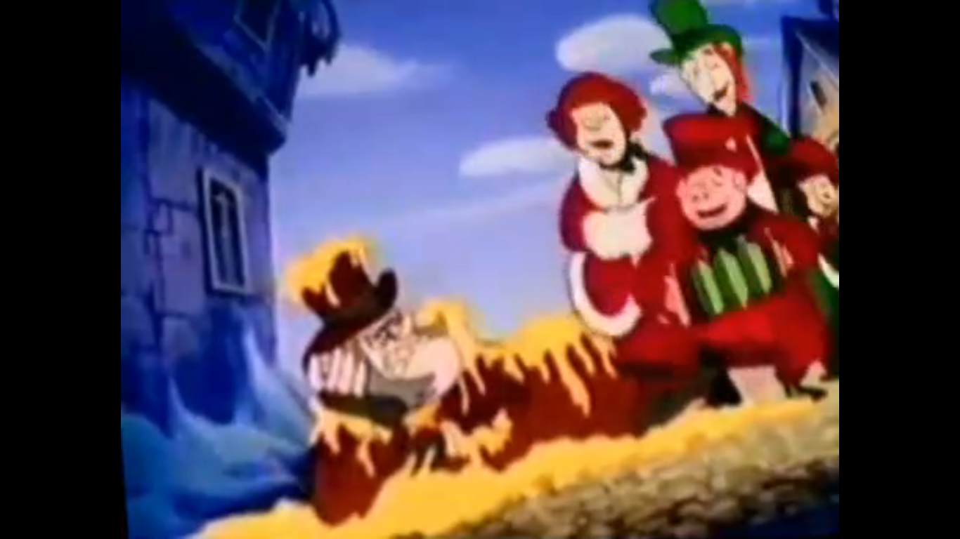 Now that all of the wrongs have been righted, it’s time for a merry Christmas! The Brown family (and Marty) are celebrating with the toy store owners. Reggie has been adopted by them and he’ll be able to work in the store now. As for the poor, downtrodden, family that had nothing but a few chestnuts to eat, well, we don’t know. I guess they’re still in the gutter because they are no where to be found. Everyone seems happy though, and even Tannen comes barging in with a Christmas goose, but upon seeing Marty he realizes he’s been tricked. Marty runs and Tannen gives chase only to collide with a cart full of figgy pudding (I guess we can’t do manure jokes on Saturday morning network television) and is left laying in the street. The carolers return to basically tells us what happened and Tannen ends it by saying he hates it, it being the pudding he’s covered in. Or Christmas. Or both! I would have thought he was going to say “Bah! Humbug!” but maybe that was too obvious? The camera pans to the sky where the DeLorean is passing by. Doc gets to finish the song by singing “And a happy new year,” only for Verne to correct him that it’s actually an old year. “Not for long,” cries his dad as the DeLorean jumps forward in time, back to the future!