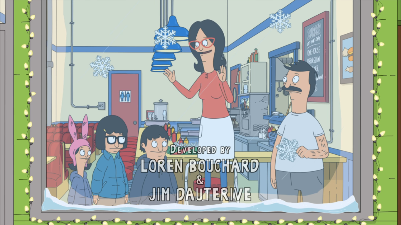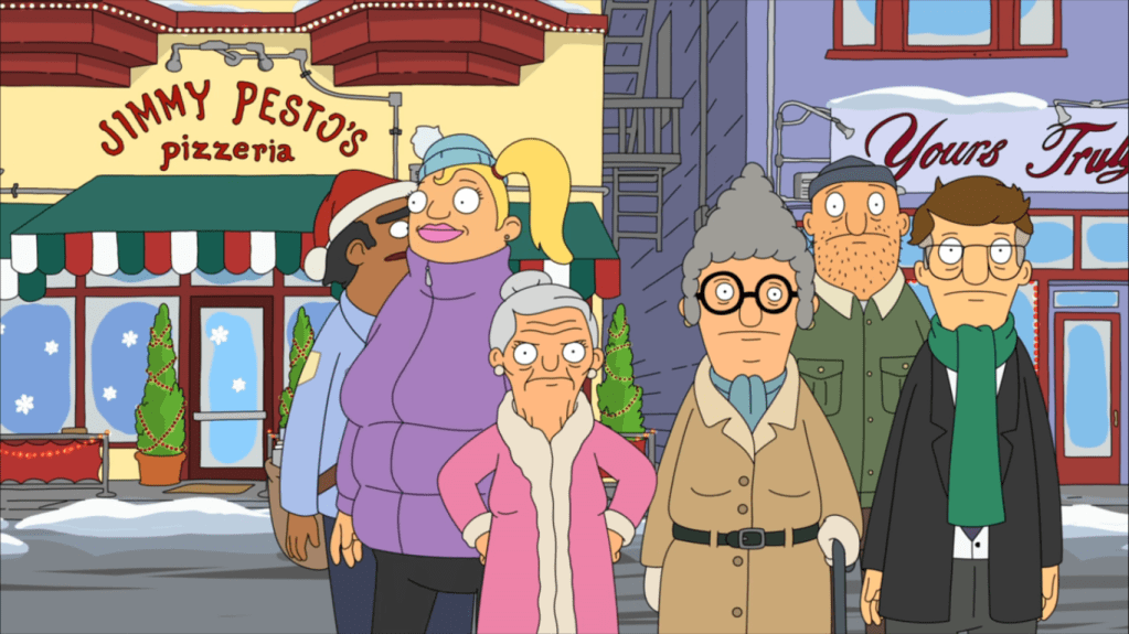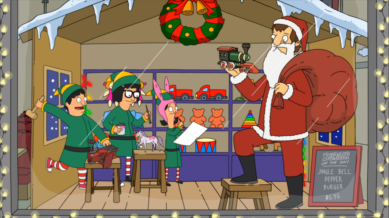 The episode begins with Linda (John Roberts) decorating the front window of the restaurant while the family looks on. She’s clearly placed snowflakes on the window, but Gene (Eugene Mirman) mistakes them for ninja stars while Tina (Dan Mintz) thinks they’re doilies. It is noted that we are seven days out from Christmas (kind of late with the decorating, Linda) so the children hand over their list of demands, as Louise (Kristen Schaal) describes it. It would seem the kids expect gifts from the parents and if anyone believes in Santa Claus it is not implied. Louise demands her own apartment (no studios), Tina would like a dry erase board to write down her thoughts and then erase them (Penis Fly Trap), while Gene wants the bobsled from the movie Cool Runnings. Bob tells the kids they can’t afford any of that stuff and when Tina asks “Even the dry erase board?” he angrily confirms even that. It’s been a tough year for the Belchers and Bob attributes it to the restaurant being mistakenly classified as a gas station in some local newsletter.