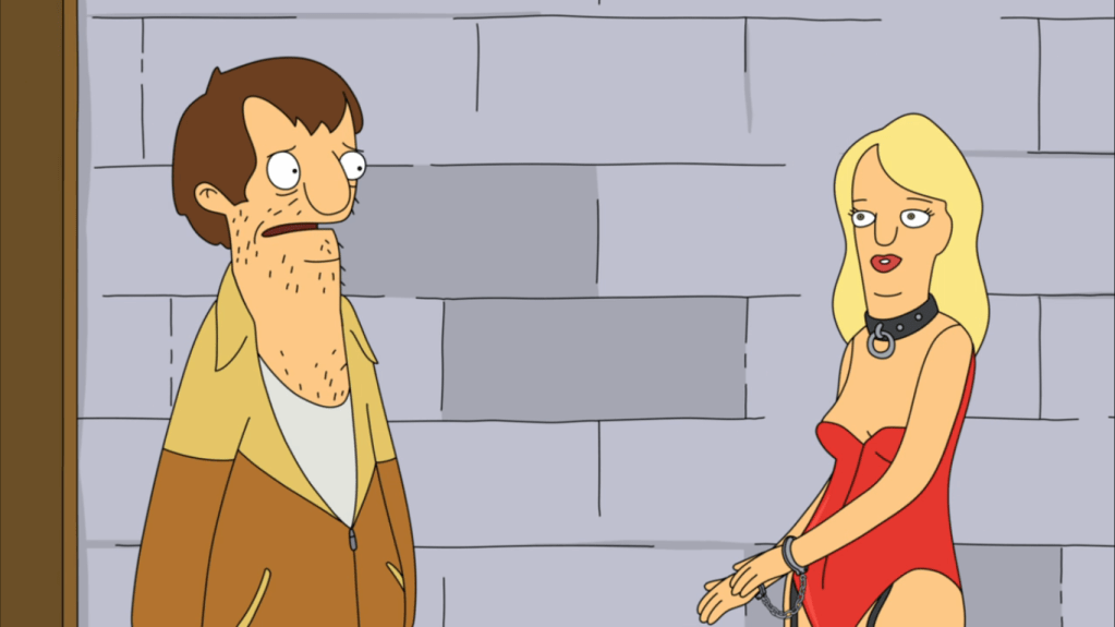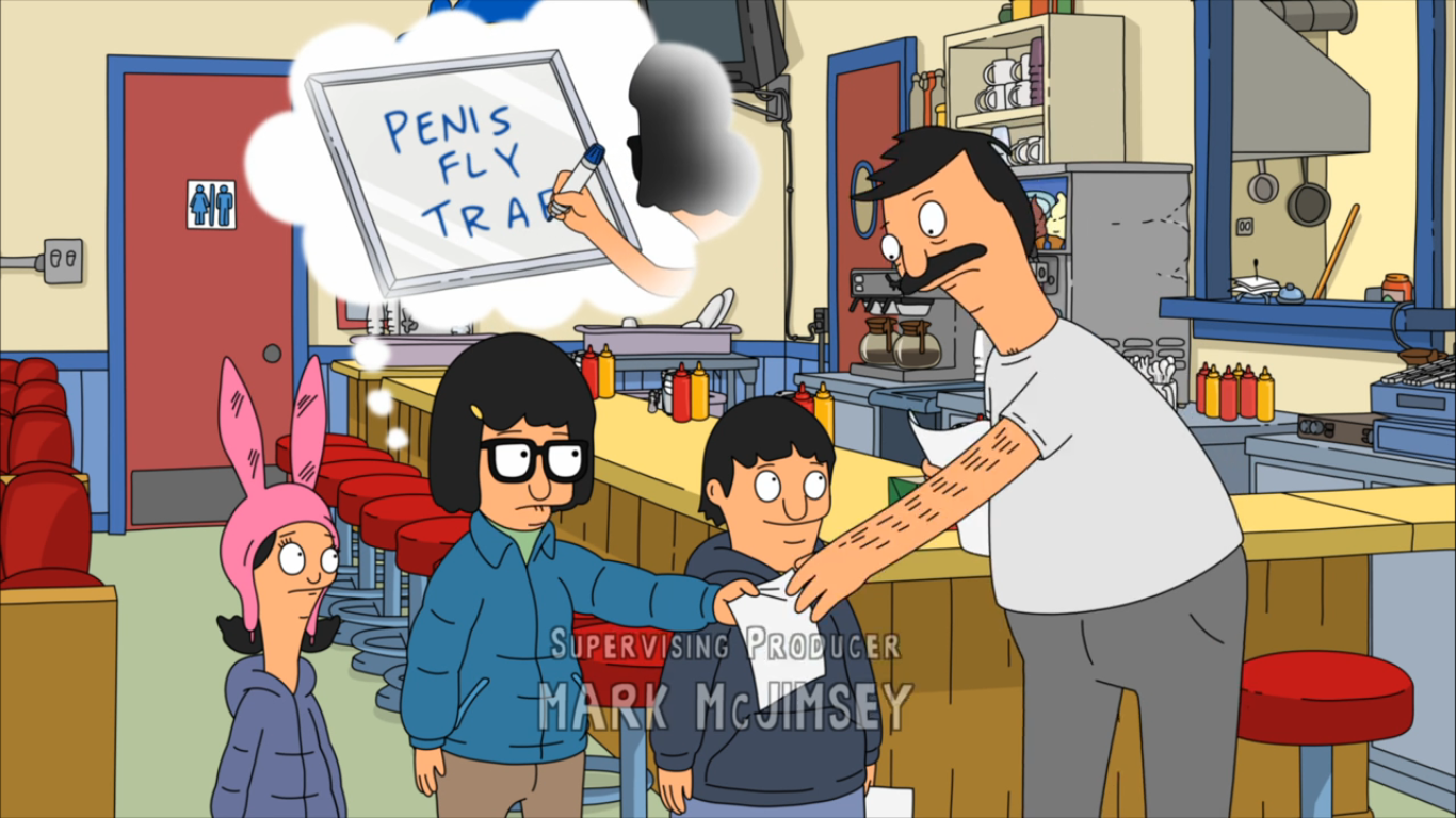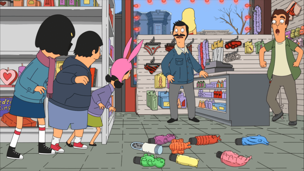 The kids, meanwhile, have snuck in because of course they did. Gene is surprised to find limbless finger puppets, which are most certainly not finger puppets. Louise can tell that her dad is getting nowhere with the clerk so she instructs her siblings to create a diversion with the…personal massagers. They turn the sex toys on and toss them on the floor where they vibrate and slither about. The clerk sees them and shouts at them to get out since they’re minors while Bob bolts and grabs Nadine. The kids lay down some lube by the door which the clerk slips and falls on as he tries to chase after them. Bob shouts back that he’ll return her after midnight while the clerk shouts out “Sickos!” A voice from the back thinks he was referring to them, but he calls back, “No, not you guys,” in a defeated tone.