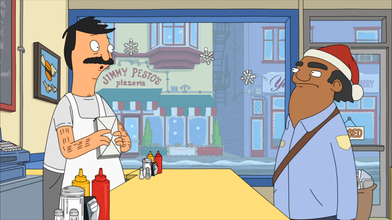 Sometime later, Mailman Mike (Tim Meadows) enters the restaurant and receives a very enthusiastic “Merry Christmas” from Linda that he responds to in his usual, deadpan manner. We can now see that the burger of the day is the One Horse Open Slaw Burger which comes with coleslaw. Not sure if it’s on the burger, or just a side, but it will set you back about six bucks. Mike hands over the mail and then stands there and awkwardly coughs. Bob picks up on the social cue here that Mike is looking for a holiday tip. Bob confesses to Mike that he never knows what to tip the mailman and Mike confirms that Bob does not. Bob then writes a number on a piece of paper and slides it over to Mike for his approval. He says it would be a good amount – if he delivered the mail once a week! Bob then hands over a wad of cash that is more than the number he wrote. Mike thanks him, then hands him some more mail which Bob has to sign for. When Bob asks if he was going to withhold his mail if he didn’t tip him, Mike assures him that he would have got the letter, just not today. He is a professional, after all.